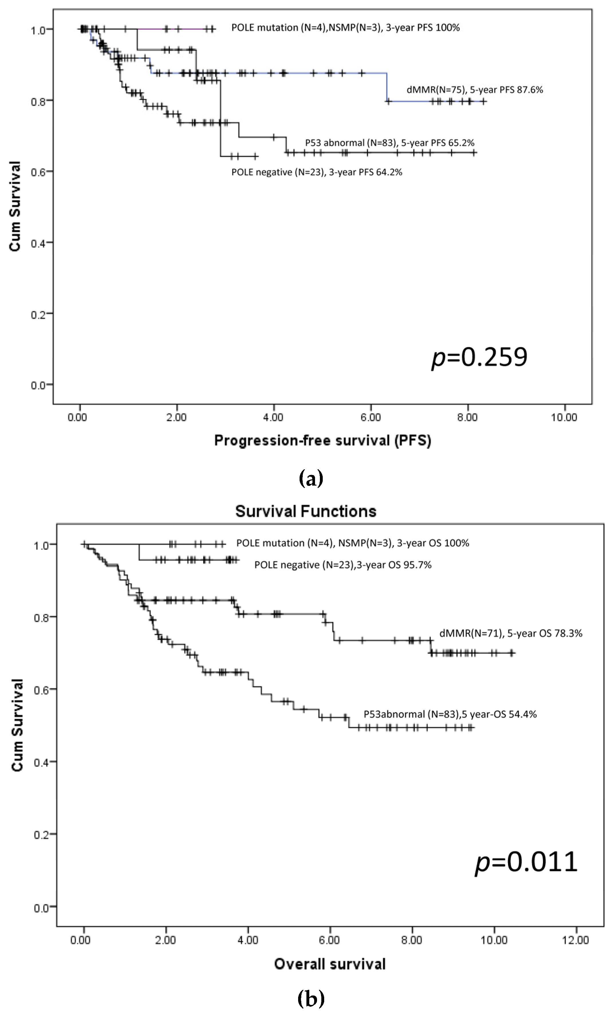 - León-Castillo, A.; de Boer, S.M.; Powell, M.E.; Mileshkin, L.R.; Mackay, H.J.; Leary, A.; Nijman, H.W.; Singh, N.; Pollock, P.M.; Bessette, P.; et al. Molecular Classification of the PORTEC-3 Trial for High-Risk Endometrial Cancer: Impact on Prognosis and Benefit From Adjuvant Therapy. J. Clin. Oncol. 2020, 38, 3388–3397. [Google Scholar] [CrossRef] [PubMed]