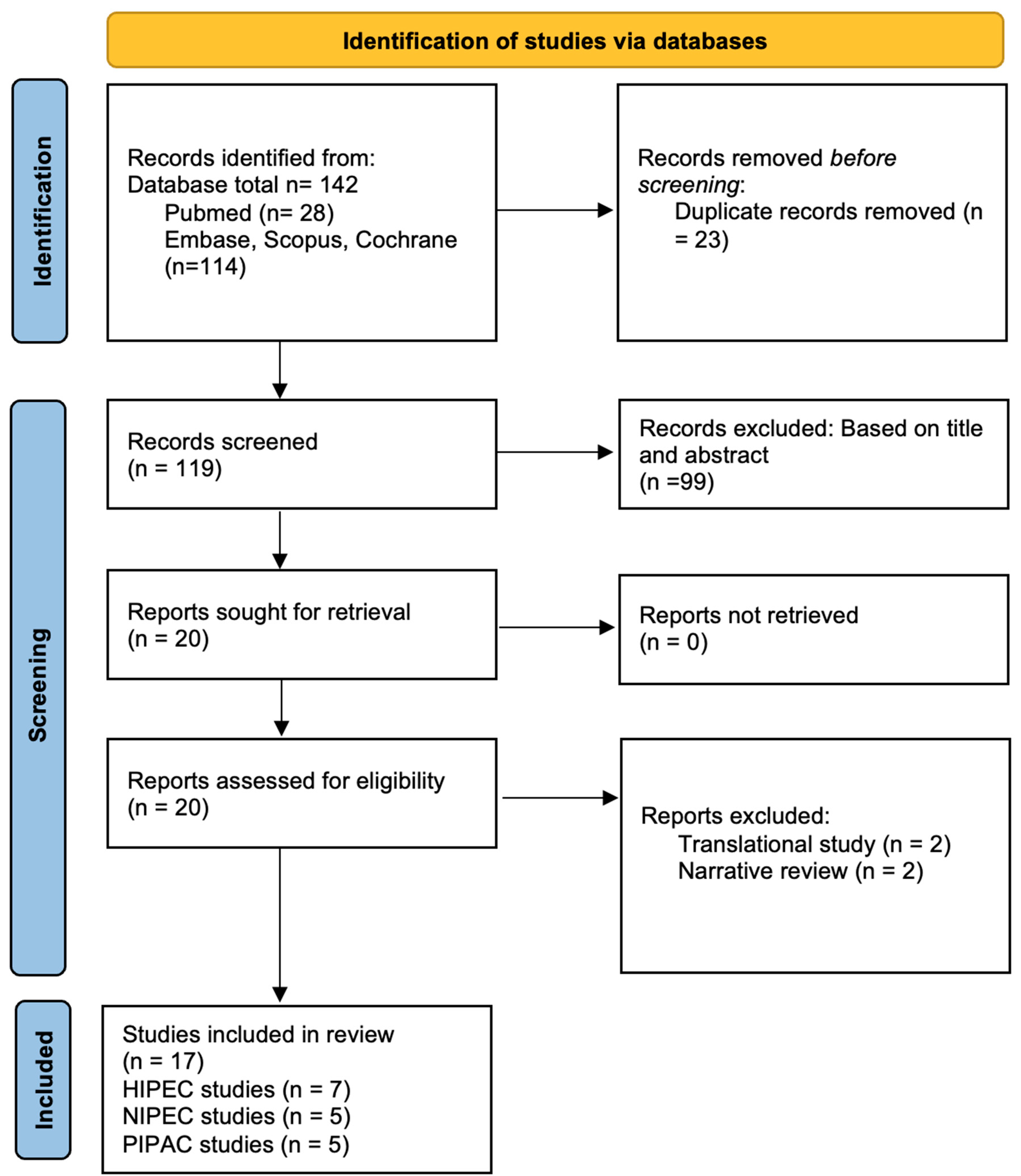 APA StyleGanatra, N., Abdelhakeem, A., Jain, P., Kamatham, S., Elantably, D., Adeoye, O., Babiker, H. M., O’Donnell, C. D., & Majeed, U. (2026). Intraperitoneal Chemotherapy Strategies in Pancreatic Ductal Adenocarcinoma: A Systematic Review of Hyperthermic Intraperitoneal Chemotherapy, Normothermic Intraperitoneal Chemotherapy, and Pressurized Intraperitoneal Aerosol Chemotherapy. Cancers, 18(2), 182. https://doi.org/10.3390/cancers18020182