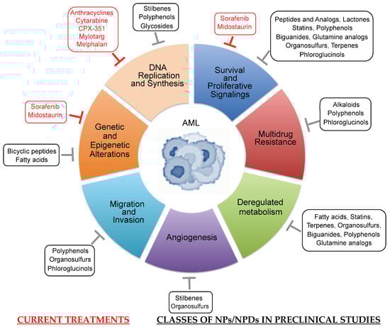 Human AML cells with abnormally high levels of proliferation and survival transmigrate from BM into peripheral blood and extramedullary organs. BM angiogenesis plays a relevant role in the pathophysiology of AML. In addition to DNA-intercalating NPs/NPDs that block DNA replication and synthesis, a number of AML biomarkers have emerged as targets of NPs and NPDs [18,19]. They are briefly summarized in this section.