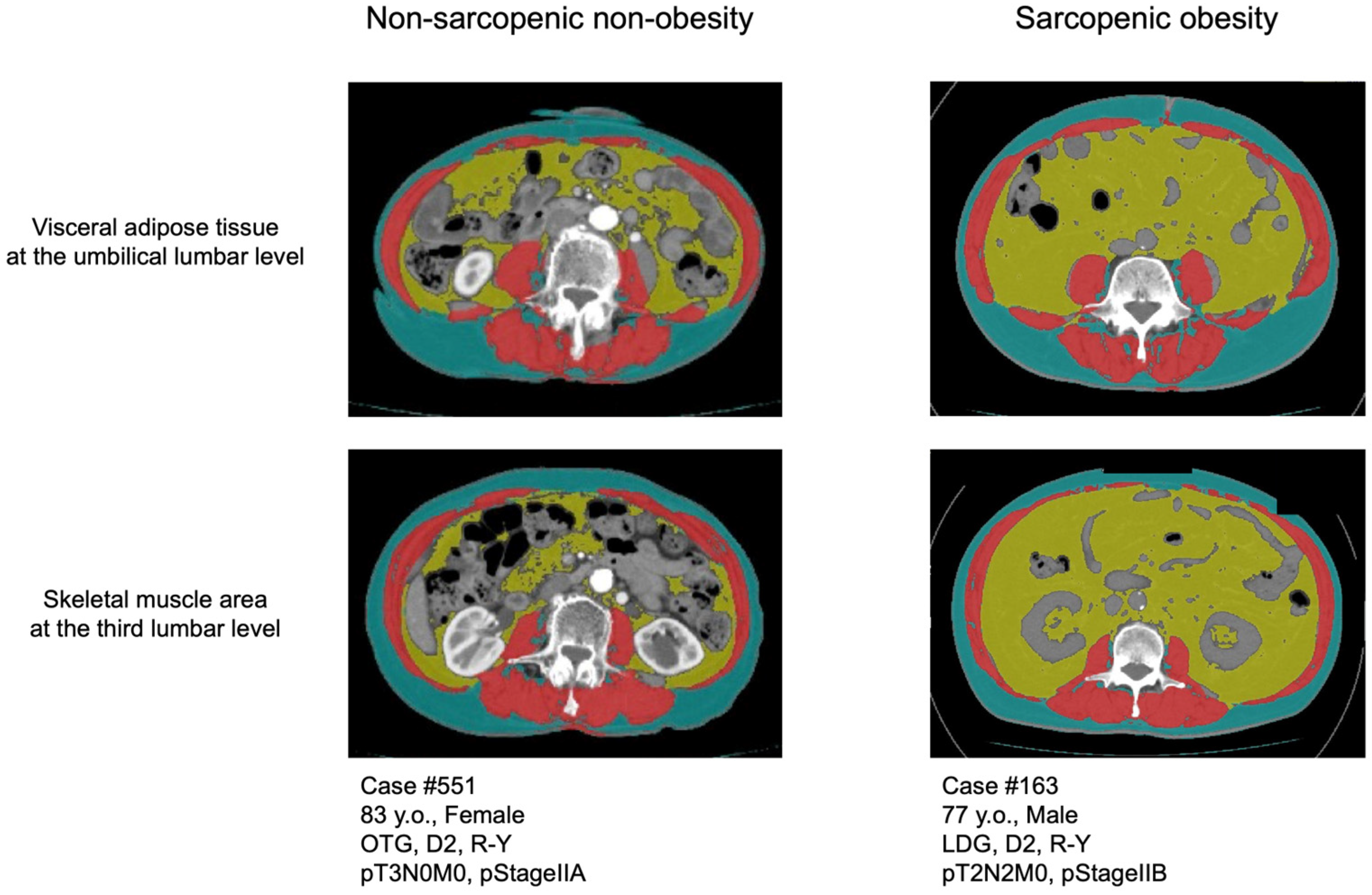 - Kim, J.; Han, S.H.; Kim, H.-I. Detection of sarcopenic obesity and prediction of long-term survival in patients with gastric cancer using preoperative computed tomography and machine learning. J. Surg. Oncol. 2021, 124, 1347–1355. [Google Scholar] [CrossRef]