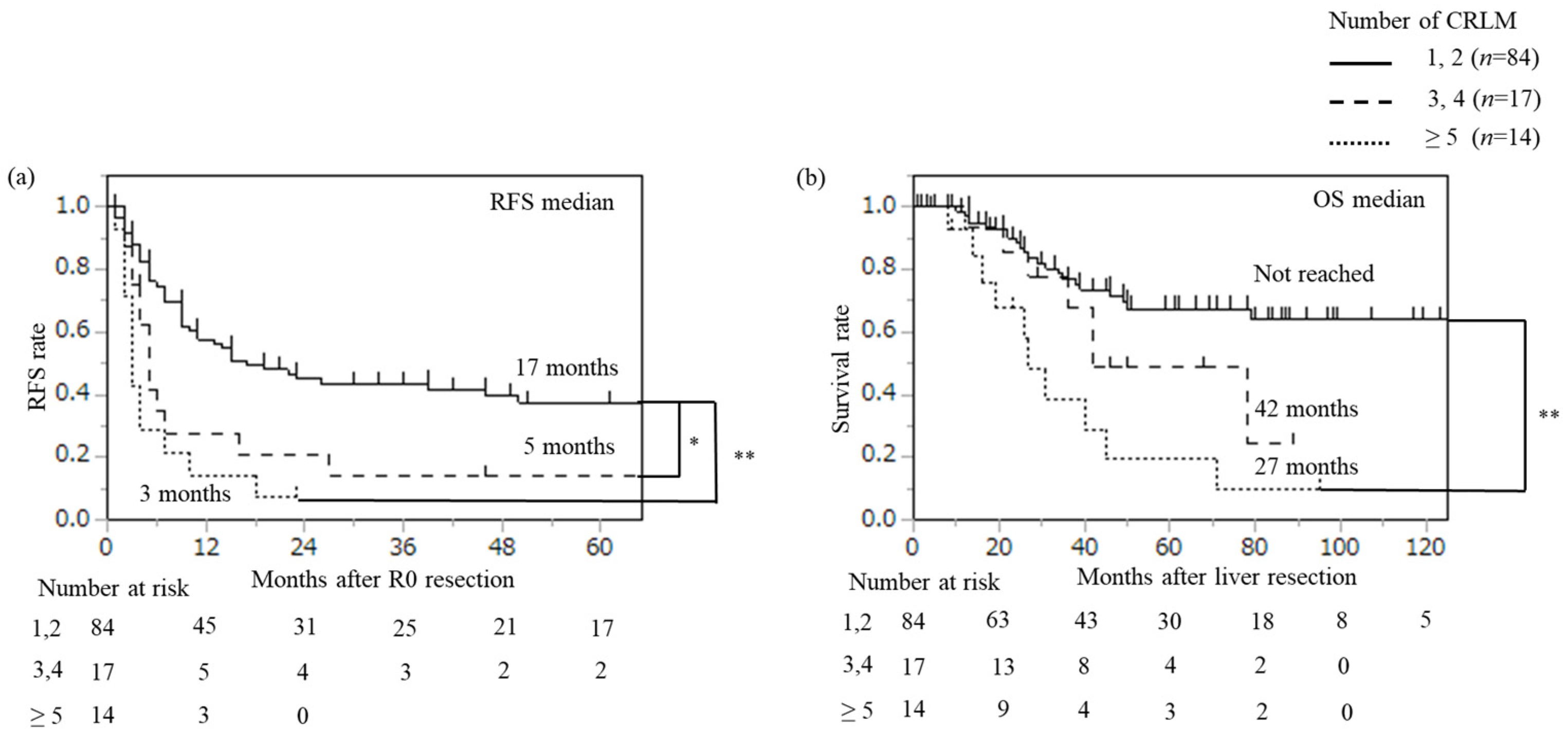 In this study, the number of CRLMs (≥3) was identified as a risk factor for recurrence and survival after initial liver resection. Furthermore, among patients with only 1 or 2 CRLMs, tumor diameter ≥ 5 cm was associated with a high risk of recurrence. Previous studies have established tumor diameter ≥ 5 cm as a significant prognostic criterion [7,12], and similarly, the number of CRLMs ≥ 5 has been associated with poor prognosis [12]. In the present study, the proportions of patients with 3 or 4 CRLMs and those with ≥5 CRLMs at risk of recurrence were similar (Figure 1). Regarding prognosis, these groups also had similar proportions of those with long-term survival. Thus, patients with ≥3 CRLMs might represent a group with poor prognosis and may face challenges in achieving a complete cure.