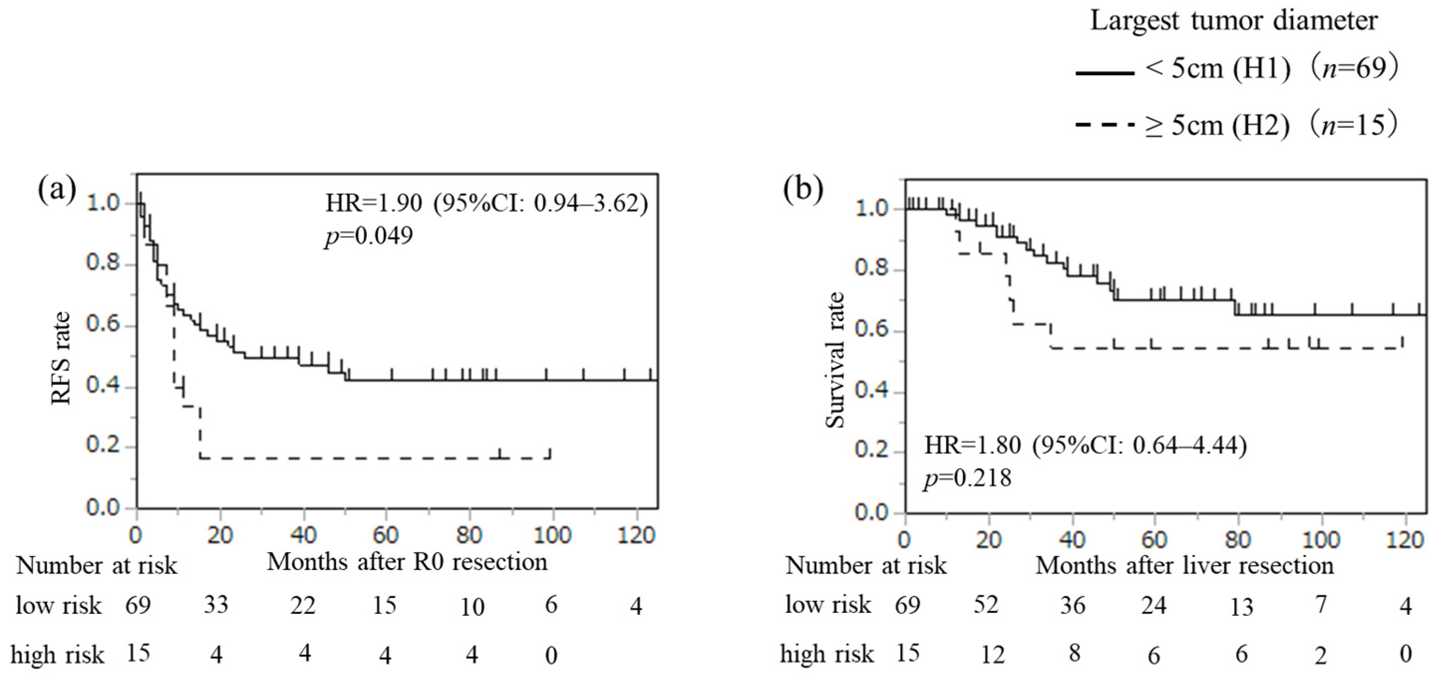 We further examined the impact of the number of CRLMs on prognosis in detail. Number of CRLMs was divided into three categories: 1, 2 (n = 84), 3, 4 (n = 17), and ≥5 (n = 14), and recurrence and survival were examined using Kaplan–Meier curves (Figure 1). Median RFS was 17 months in patients with 1 or 2 CRLMs, 5 months in those with 3 or 4 CRLMs, and 3 months in those with ≥5 CRLMs. There was a significant difference in RFS between patients with 1 or 2 CRLMs and those with 3 or 4 CRLMs (p = 0.009, based on Bonferroni correction). On the other hand, there was no difference in RFS between patients with 3 or 4 CRLMs and those with ≥5 CRLMs (p = 0.170). Median OS time was not reached in patients with 1 or 2 CRLM. In contrast, median OS time was 42 months in patients with 3 or 4 CRLMs and 27 months in those with ≥5 CRLMs. There was a significant difference in OS between patients with 1 or 2 CRLMs and those with ≥5 CRLMs (p < 0.001), while there was no difference between patients with 3 or 4 CRLMs and those with ≥5 CRLMs (p = 0.087). In patients with 1 or 2 CRLMs, only the diameter of the largest tumor ≥ 5 cm was identified as a significant predictor for recurrence (p = 0.049) (Figure 2). Thus, the number of CRLMs (≥3) and the diameter of the largest tumor ≥ 5 cm in patients with 1 or 2 CRLMs could serve as novel prognostic criteria for predicting high-risk groups in patients with CRLM who underwent initial liver resection.