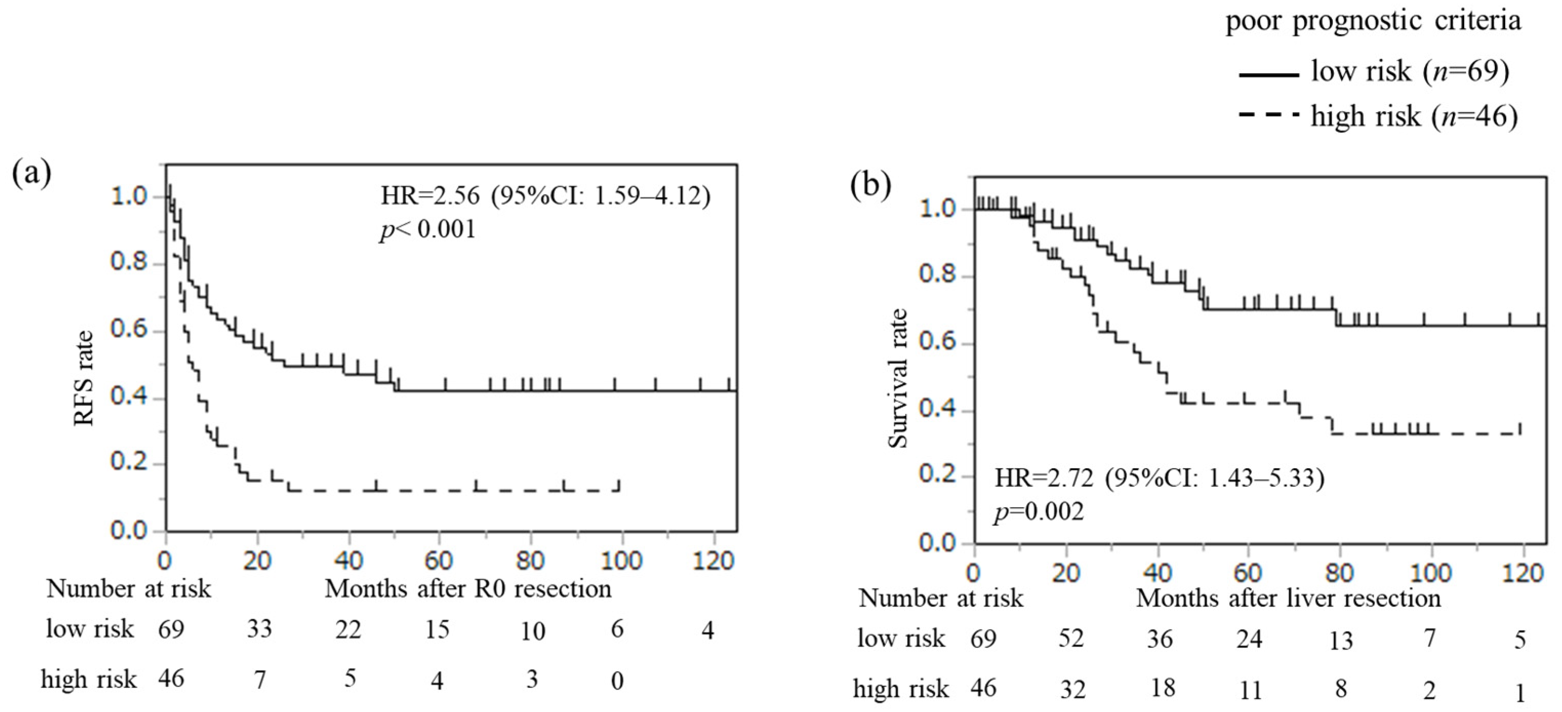 This was a multi-center retrospective observational study. We enrolled 115 consecutive patients with CRLM who underwent initial liver resection with R0 surgery (excluding 17 patients with R1/R2 surgery) at the Department of Gastroenterological Surgery, Yamaguchi University Graduate School of Medicine, and the Department of Surgery at Ube Central Hospital, between 2010 and 2021. Ube Central Hospital is affiliated with Yamaguchi University Hospital, and institutional practices for CRLM management—including surgical indications, perioperative care, and follow-up surveillance—were aligned between the two centers, as detailed below. The decision regarding resectability was made at a conference involving hepatobiliary and pancreatic surgeons at each institution. We defined “technically resectable” for CRLMs as those with no proximity to three hepatic veins, no proximity to the left or right portal branches, and a residual liver volume of 30% or more.