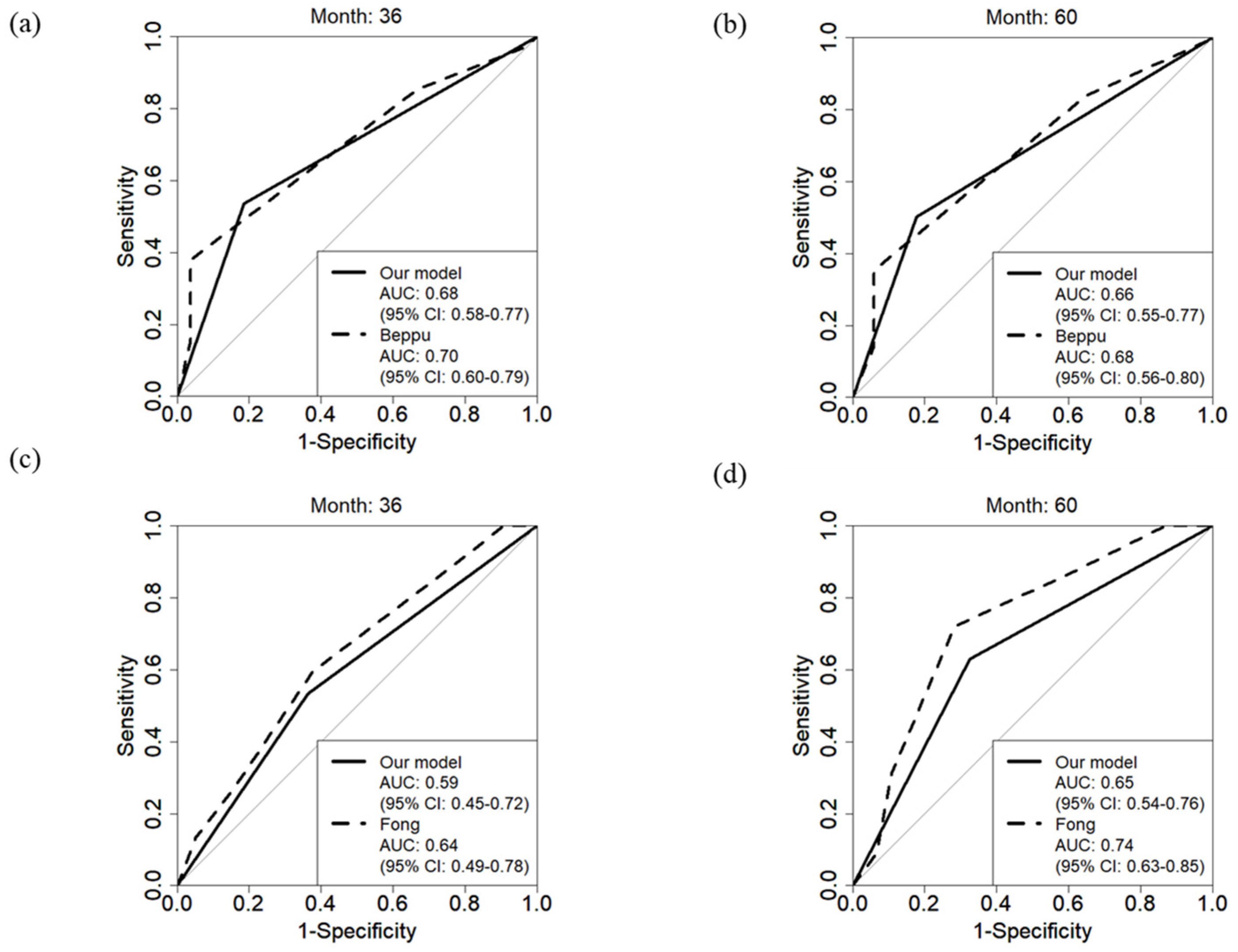 “The number of CRLMs (≥3)” or “diameter of the largest tumor ≥ 5 cm in patients with 1 or 2 CRLMs” are each defined as risk factors, and cases exhibiting either factor are classified as the high-risk group. Figure 3 shows the Kaplan–Meier curves of RFS and OS according to the novel prognostic criteria. The high-risk group and elevated NLR, as defined by these prognostic criteria, were significantly associated with increased risk of recurrence (Table S1; HR = 2.05, 95% CI: 1.22–3.45, p = 0.007, and HR = 2.00, 95% CI: 1.11–3.47, p = 0.022, respectively) and reduced survival (Table S2; HR = 2.34, 95% CI: 1.16–4.47, p = 0.017). We calculated the area under the curve (AUC) to assess the predictive accuracy of our model for recurrence and OS, applying time-dependent ROC curve analysis at 36- and 60-month points (Figure 4). The AUCs for recurrence in our model were 0.68 (95% CI: 0.58–0.77) at 36 months and 0.66 (95% CI: 0.55–0.77) at 60 months. For OS, AUCs were 0.59 (95% CI: 0.45–0.72) at 36 months and 0.65 (95% CI: 0.54–0.76) at 60 months. For comparison, the Beppu nomogram yielded AUCs of 0.70 (p = 0.683) at 36 months and 0.68 (p = 0.766) at 60 months for recurrence, and Fong’s clinical risk score resulted in AUCs of 0.64 (p = 0.430) at 36 months and 0.74 (p = 0.074) at 60 months for OS. When this risk model was examined in the preoperative chemotherapy group (n = 72), there was a significant difference in RFS (HR = 3.11, 95% CI: 1.68–6.04, p < 0.001) and OS (HR = 2.80, 95% CI: 1.28–6.76, p = 0.010) between the low-risk and high-risk groups.
