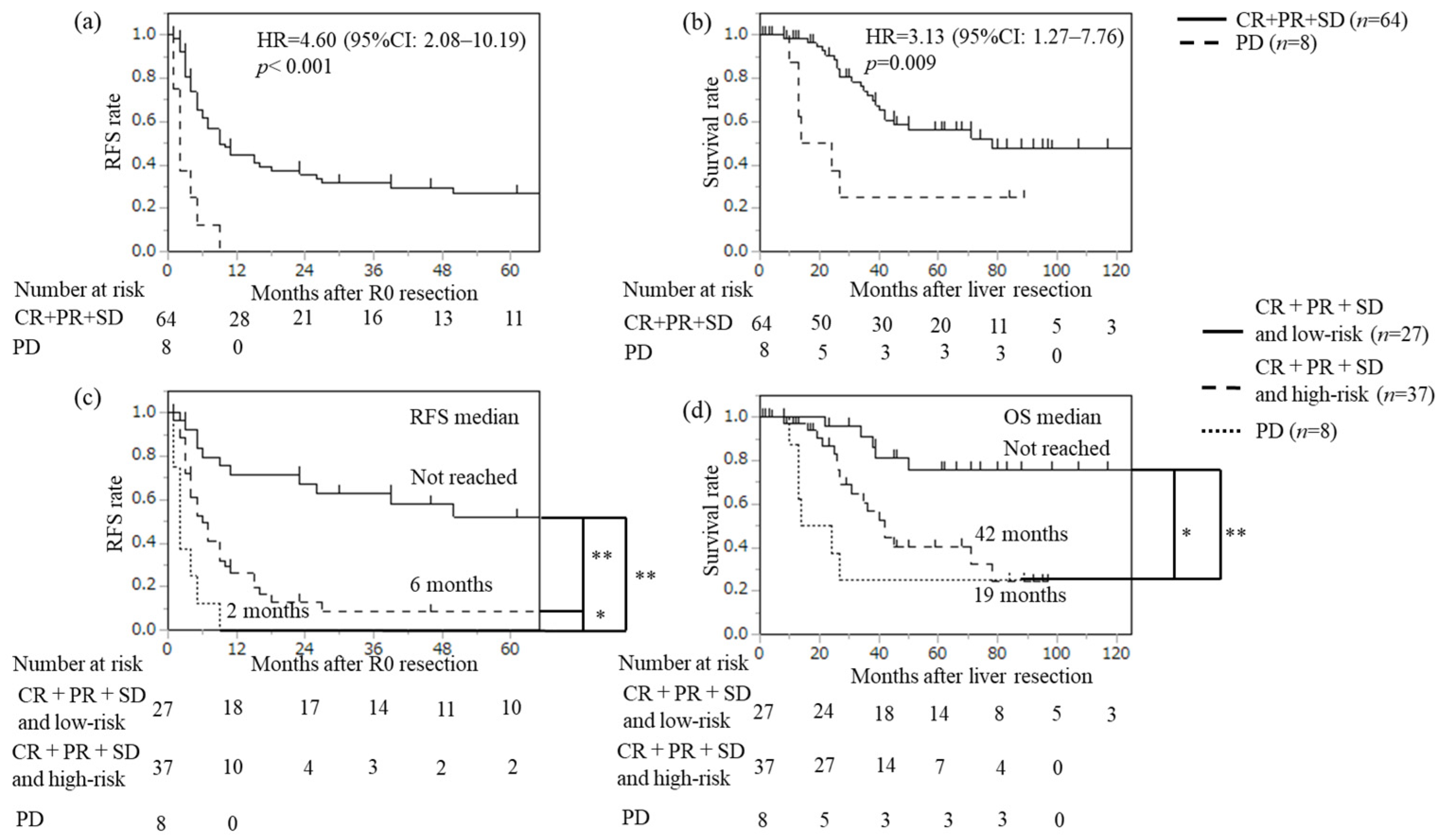 The numbers of patients with complete response (CR), partial response (PR), stable disease (SD), and progressive disease (PD) were 1, 32, 31, and 8, respectively. Both RFS and OS were significantly worse in the PD group than in the CR + PR + SD group (RFS: HR = 4.60, 95% CI: 2.08–10.19, p < 0.001; OS: HR = 3.13, 95% CI: 1.27–7.76, p = 0.009) (Figure 5a,b). Additionally, when the CR + PR + SD group was divided into low-risk and high-risk groups using these prognostic criteria, there was a significant difference in RFS between the low-risk and high-risk groups (p < 0.001). And also, OS showed a significantly poorer prognosis in the high-risk group (p = 0.002) (Figure 5c,d).