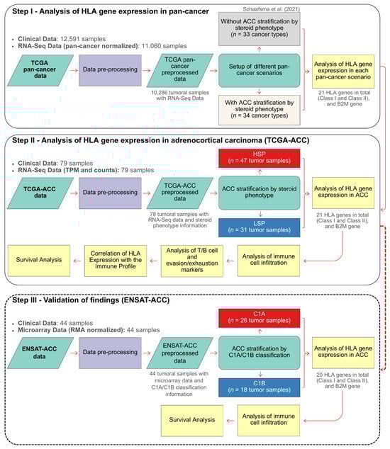 Flowchart of the study design. The analytical strategy was divided into three main steps. Step I: Analysis of HLA/B2M Gene Expression in Pan-Cancer. This step established a reference landscape by comparing a scenario with an unstratified ACC cohort (33 cancer types), following Schaafsma et al. (2021) [20], to one that distinguishes the ACC HSP and LSP subgroups (totaling 34 cancer types). Step II: In-Depth Analysis of the TCGA-ACC Cohort. This step investigated the direct differences in HLA/B2M expression between the HSP and LSP phenotypes and their association with immune cell infiltration, T/B cell and evasion/exhaustion markers, and patient survival. Step III: Validation of Findings (ENSAT Cohort). This final step aimed to validate the findings from the TCGA-ACC cohort by analyzing HLA/B2M gene expression in the independent ENSAT-ACC cohort, which was stratified into the C1A and C1B molecular subtypes. This also included an analysis of immune cell infiltration and patient survival within the ENSAT cohort.