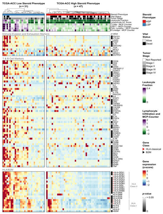 Of these, the 78 samples with available steroid phenotype information were stratified into high (HSP, n = 47) and low (LSP, n = 31) steroid production subgroups based on the transcriptional profile classification established by Zheng et al. (2016) [8] and further characterized by Muzzi et al. (2021) [12]. Although clinical hormone data were available (Table 1), transcriptomic stratification was chosen, as it may more accurately reflect the intratumoral steroidogenic machinery [24]. Recent studies have established this cohort as a valuable resource for dissecting ACC heterogeneity [17,25,26,27,28]. Additional annotations for cortisol excess, C1A/C1B molecular subtypes, tumor stage, vital status, and tumor purity were also retrieved. To further characterize the tumor immune landscape, we integrated data from Thorsson et al. (2018) [25], including immune subtypes, stromal fraction, leukocyte fraction, and lymphocyte infiltration scores. Log2-transformed Transcripts Per Million (TPM) gene expression data [log2(TPM + 1)] were used (dataset ID: TCGA-ACC.star_tpm.tsv). The expression analysis focused on a panel of 22 target genes: 21 HLA genes (Class I and Class II) and B2M gene (which encodes β2-microglobulin, an essential component of HLA class I molecules). This panel was utilized to maintain consistency with previous pan-cancer HLA studies established by Schaafsma et al. (2021) [20].