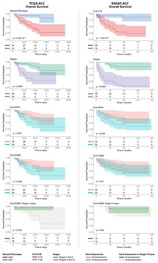 Regarding individual gene expression in the TCGA-ACC cohort, only the Class II genes HLA-DQB2 and HLA-DPA1 were significantly associated with survival. High expression of HLA-DQB2 (p = 0.046) and HLA-DPA1 (p = 0.031) indicated a better prognosis (Figure 7, rows 3 and 4), though the associations were marginally significant. Analysis of the ENSAT cohort confirmed the prognostic trend for HLA-DPA1 (p = 0.045), while HLA-DQB2 did not reach significance (p = 0.51). To investigate whether the prognostic value of HLA expression was independent of tumor stage, we performed a stratified analysis. Notably, even within the subgroup of TCGA-ACC patients with Stage II tumors, which contains a balanced number of HSP (n = 18) and LSP cases (n = 19), high HLA-DQB2 expression continued showing a significant survival advantage (p = 0.034) (Figure 7, row 5).