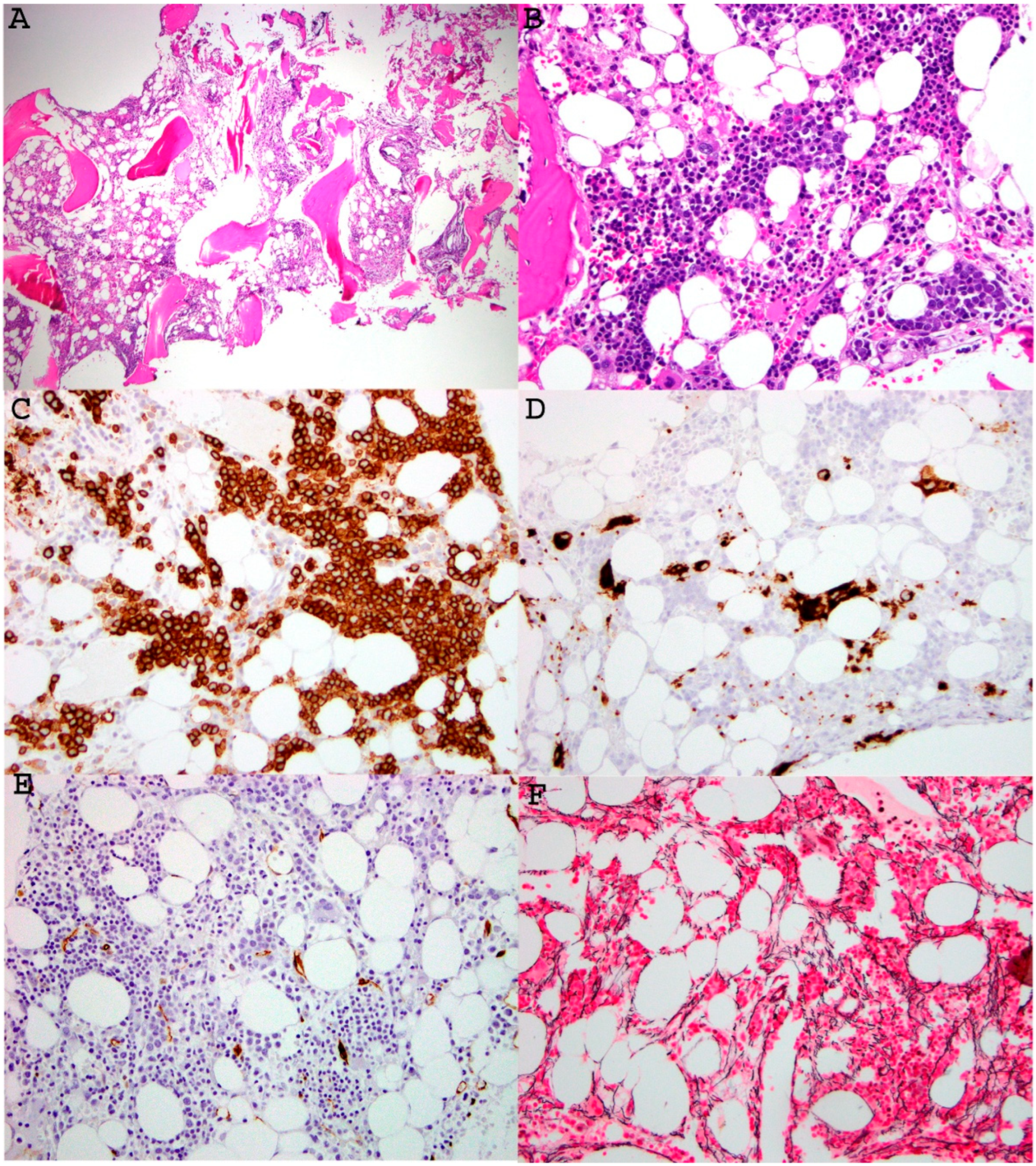 Figure 2. Representative images of bone marrow findings in a 21-year-old patient with MDS associated with germline GATA2 mutation. A low-power view of the bone marrow core biopsy ((A), H&E, ×100) showed patchy fibrosis, decreased myelopoiesis, and atypical/dysplastic megakaryocytes. A medium power of view of the core ((B), H&E, ×200) highlighted erythroid preponderance and left-shifted maturation, and hypolobated megakaryocytes. Myeloid precursors were decreased without morphologic evidence of excess myeloblasts. Immunohistochemical stains were performed on the core biopsy, which showed increased CD71 positive erythroid lineage, CD61-positive dysplastic small megakaryocytes, and no increase in CD34 positive blasts ((CE), immunoperoxidase, ×200). Reticulin stain highlighted mild reticulin fibrosis (MF1-2/3) ((F), reticulin stain, ×200). NGS study confirmed presence of GATA2: p.L315Cfs*11, c.942-943delinsC (VAF 49.7%) in both bone marrow and skin specimens, supporting a diagnosis of GATA2 germline mutation. This image is provided courtesy of Dr. Ling Zhang.