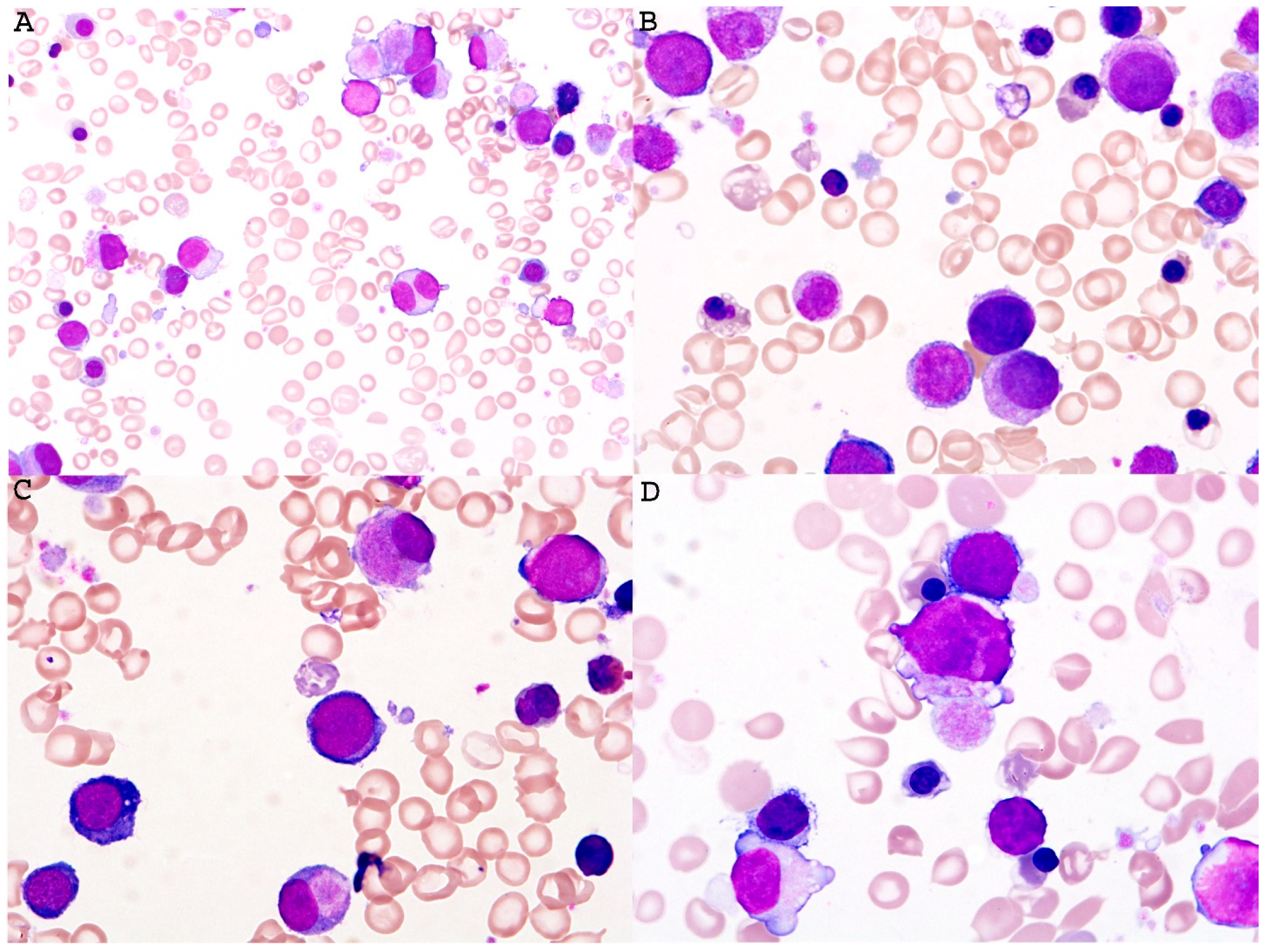 Down syndrome represents the most prevalent chromosomal aneuploidy observed in neonates. Myeloid neoplasms in Down syndrome (DS) represent a unique spectrum of diseases that differ significantly from leukemia in the general population. They typically follow two well-defined patterns: (1) transient abnormal myelopoiesis (TAM) and (2) myeloid leukemia associated with Down syndrome (ML-DS). The former presents within the first three weeks of birth and shows leukoerythroblastosis with giant platelets and megakaryoblasts in the blood (Figure 3) and undergo spontaneous remission within 3 months with no need for treatment; however, around a quarter of these patients will develop acute leukemia or MDS. The second group develops MDS or AML with megakaryoblastic differentiation, which requires appropriate treatment according to the therapeutic guideline for ML-DS.