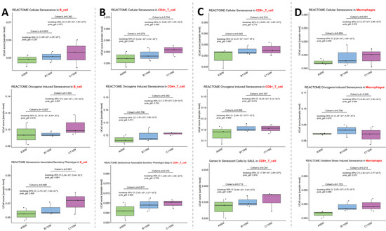In B cells (Figure 2A, panel on the far left), REACTOME Cellular Senescence pathway activity increased from A35w to B110w (Cohen’s d = 0.603) and continued to increase from B110w to C110w (Cohen’s d = 0.342). For REACTOME Oncogene Induced Senescence, activity showed minimal difference between A35w and B110w groups (Cohen’s d = −0.007) but was significantly enhanced in C110w when compared to B110w (Cohen’s d = 1.003). The REACTOME Senescence Associated Secretory Phenotype exhibited a heightened activity in B110w when compared to A35w (Cohen’s d = 0.680) and a further increase in C110w vs. B110w (Cohen’s d = 0.801).