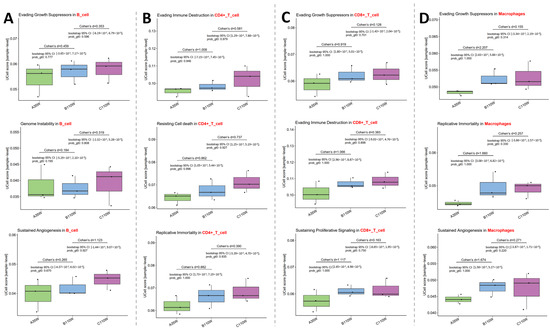 In CD4+ T cells (Figure 3B, second panel from the left), Evading Immune Destruction showed a greater increase in B110w vs. A35w (Cohen’s d = 1.008) than in C110w vs. B110w (Cohen’s d = 0.581). Resisting Cell Death exhibited elevated activity in B110w vs. A35w (Cohen’s d = 0.862) and a continued increase in C110w vs. B110w (Cohen’s d = 0.737). Replicative Immortality was enhanced in B110w vs. A35w (Cohen’s d = 0.882) and remained higher in C110w vs. B110w (Cohen’s d = 0.390).