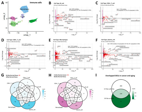 Overlapping DEGs between chicken ovarian aging and carcinogenesis. (A) UMAP visualization confirms the distribution of major immune cell subsets (B cells, CD4+ T cells, CD8+ T cells, macrophages, plasma cells). (B–F) Volcano plots of DEGs in B cells (B), CD4+ T cells (C), CD8+ T cells (D), macrophages (E), and plasma cells (F) during ovarian aging (B110w vs. A35w). (G) Venn diagram reveals 216 genes dysregulated across at least two immune cell types during aging. (H) During carcinogenesis (C110w vs. B110w), 510 genes were commonly dysregulated across immune subsets, with 14 shared across all five immune cell types. (I) Crucially, 216 genes were commonly dysregulated in both aging and carcinogenesis, representing core molecular links between these processes.
