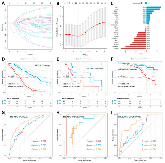 Construction and validation of the 20-gene prognostic model for human ovarian cancer. (A) LASSO coefficient profiles for 42 survival-associated genes. (B) Cross-validation error curve to select optimal λ for LASSO regression. (C) Coefficient distribution of the 20-gene prognostic signature. Risk score formula: Risk score = (0.138 × SIRT2) + (0.127 × MGP) + (0.068 × DUSP1) + (0.056 × COLEC12) + (0.037 × ANXA2) + (0.037 × GNS) + (0.035 × IL1B) + (0.030 × BAG3) + (0.023 × GPX3) + (−0.001 × MARCKSL1) + (−0.008 × UCHL1) + (−0.010 × EIF5B) + (−0.018 × QPRT) + (−0.080 × SNX22) + (−0.092 × MANF) + (−0.095 × JCHAIN) + (−0.120 × HSP90AA1) + (−0.122 × PDIA4) + (−0.134 × OTUB1) + (−0.158 × FLOT1) + (−0.200 × HSD17B1) + (−0.243 × IGFBP7). (D) Kaplan–Meier survival curves for high-risk vs. low-risk groups in TCGA training set. High-risk patients (n = 189) had significantly worse OS than low-risk patients (n = 189; HR = 3.65, 95% CI: 2.80–4.75). (E) GSE32063 validation set confirmed the prognostic value (HR = 2.89, 95% CI: 1.22–6.84). (F) GSE140082 validation set showed consistent results (HR = 3.66, 95% CI: 2.45–5.47). (G–I) ROC curves for 1-, 3-, and 5-year overall survival prediction in TCGA (G), GSE32063 (H), and GSE140082 (I) datasets.