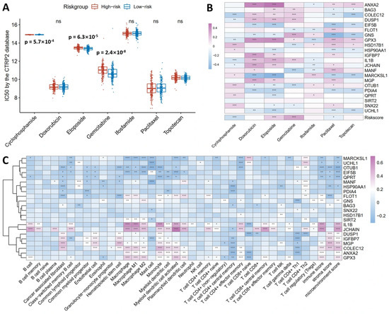 Clinical utility of the 20-gene prognostic model in predicting chemotherapy response and immune infiltration. (A) High-risk group showed a significantly lower IC50 for Cyclophosphamide (p = 5.7 × 10−04), indicating an enhanced sensitivity, but a higher IC50 for Etoposide (p = 6.3 × 10−05) and Gemcitabine (p = 2.4 × 10−05), indicating resistance. (B) Correlation heatmap shows COLEC12, DUSP1, GPX3, and IL1B positively correlate with Doxorubicin, Etoposide, and Gemcitabine sensitivity, while EIF5B, GNS, HSP90AA1, MARCKSL1, PDIA4, and UCHL1 negatively correlate with Etoposide, Paclitaxel, and Topotecan sensitivity. The risk score negatively correlated with Cyclophosphamide and Paclitaxel IC50 but positively with Etoposide and Gemcitabine IC50. (C) Immune infiltration analysis revealed B cells positively correlated with GPX3, IL1B, and JCHAIN; macrophages positively associated with ANXA2, COLEC12, FLOT1, GNS, GPX3, IL1B, JCHAIN, MGP, and SIRT2; CD4+ Th1 cells positively correlated with OTUB1 and SNX22; CD8+ T cells correlated positively with JCHAIN and negatively with BAG3 and DUSP1. Spearman correlation coefficients are color-coded (red: positive, blue: negative). * p < 0.05, ** p < 0.01, and *** p < 0.001, ns means no significance.