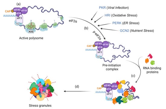 - Kedersha, N.; Anderson, P. Mammalian Stress Granules and Processing Bodies. Methods Enzymol. 2007, 431, 61–81. [Google Scholar] [PubMed]