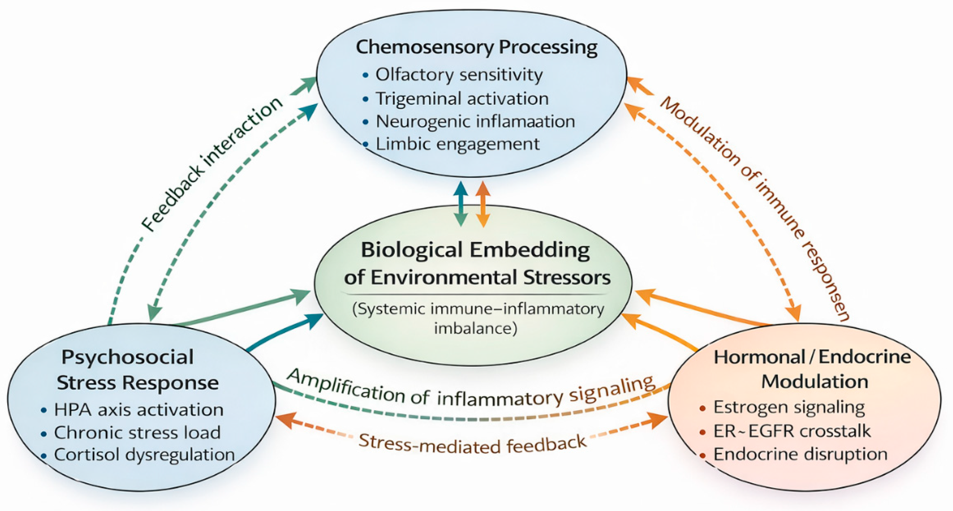 Importantly, emerging evidence suggests that environmental exposures should not be conceptualized solely as chemical insults but also as sensory and psychosocial stressors that engage multiple physiological systems. Airborne pollutants interact with the respiratory epithelium, olfactory and trigeminal pathways, neuroendocrine signaling, and immune surveillance mechanisms, all of which exhibit sex-specific modulation [