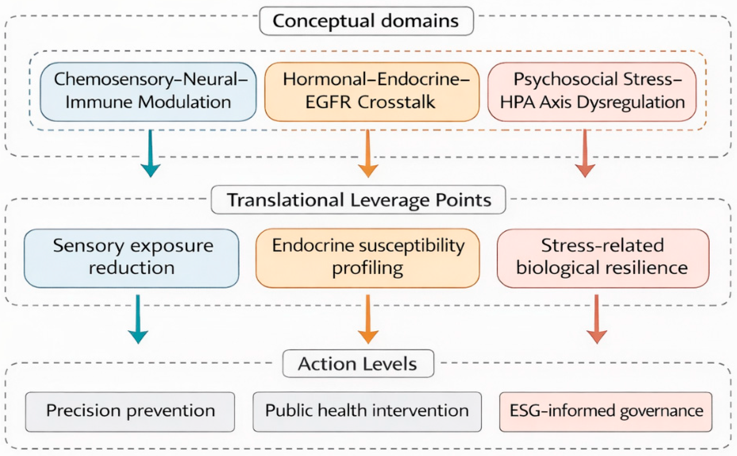 Taken together, chemosensory amplification, hormonal modulation, and psychosocial stress form an interconnected network rather than discrete pathways. Sensory processing can potentiate stress responses; hormonal regulation can shape immune consequences of stress; and psychosocial factors can modulate both sensory perception and endocrine signaling. The present review proposes that lung adenocarcinoma among non-smoking women emerges from cumulative multisystem imbalance rather than single-agent causation, a conceptual orientation that aligns mechanistic evidence across domains without attributing this integration to any single study.