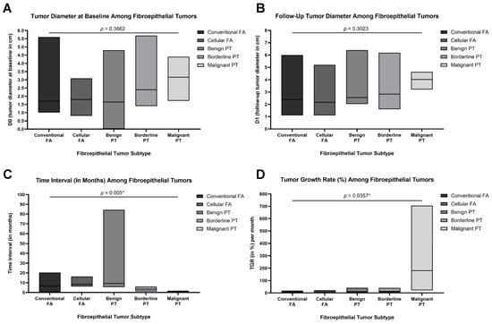 Box plots demonstrating key tumor metrics across the five fibroepithelial tumor subtypes: conventional fibroadenoma (FA), cellular FA, benign phyllodes tumor (PT), borderline PT, and malignant PT (total N = 32). (A) Baseline tumor diameter (D0) in centimeters measured radiologically at initial presentation. (B) Tumor diameter at follow-up (Dt) in centimeters, measured at the time of surgical excision or latest imaging. (C) Time interval (in months) between initial and follow-up measurements, showing significantly shorter intervals for borderline and malignant PTs (p = 0.005). (D) Tumor growth rate (TGR, expressed as % per month), calculated using the change in tumor diameter over time, revealing significantly accelerated growth in malignant PTs compared to other subtypes (p = 0.0357). Data are presented as medians and floating bars (minimum to maximum). Statistical comparisons were conducted using Kruskal–Wallis tests followed by pairwise post hoc analyses where appropriate. Asterisks indicate statistical significance (* p < 0.05).