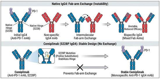 Prevention of Fab-arm exchange by the S228P mutation in the IgG4 hinge region of Cemiplimab. The S228P mutation stabilizes the hinge, preventing the formation of bispecific antibodies and ensuring a stable, monospecific therapeutic molecule.