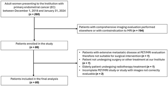 In this prospective study (ClinicalTrials.gov ID: NCT04212910), 80 patients aged ≥18, with histological diagnosis of EC, no contraindication to preoperative [18F]FDG PET/MRI, and suitability for surgical intervention were enrolled between December 2018 and January 2024. A flow diagram showing participant selection is displayed in Figure 1. The study received approval from the Institution’s Ethics Committee and informed consent was obtained from all participants. Instrumental and clinical follow-up data were collected until February 2025. All procedures were carried out in accordance with the Declaration of Helsinki (1964) and its later amendments.
