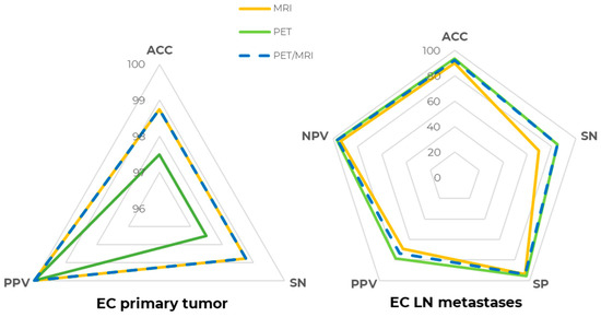 [18F]FDG PET/MRI diagnostic performance at the patient level. Spider plot summarizing [18F]FDG PET (green line), MR (yellow line), and [18F]FDG PET/MR (dashed blue line) diagnostic performance in staging EC primary tumor (right) and lymph node (LN) metastases (left). ACC: accuracy, SN: sensitivity, SP: specificity, PPV: positive predictive value, NPV: negative predictive value.