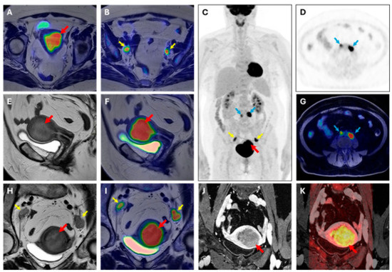 [18F]FDG PET/MRI scan. Image of a 63-year-old woman with endometrial cancer (stage IIIC, endometrioid grade 2, LVSI positive, p53 preserved, MMRd, myometrial invasion > 50%). (A,B) axial large field-of-view T2W-PET fusion image, (C) coronal whole body PET, (D) axial PET image, (E) sagittal T2W image, (F) sagittal T2W-PET fused image, (G) axial T1 fat suppression–PET fused image, (H) axial oblique T2W image, (I) axial oblique T2W-PET fused image, (J) axial oblique T1 post-contrast agent administration, (K) axial oblique T1 post-contrast agent administration-DWI b1000 fused image. Volume index: 114 cc; TTV: 59 cc; TVR: 68%; ADCmean: 1.19 × 10−3 mm2/s; ADCmin: 0.253 × 10−3 mm2/s. PET parameters of endometrial cancer SUVmax 19.42; SUVmean:13.27; MTV: 34.15; TLG: 453.2. Red arrow: primary EC; yellow arrow: pelvic lymph node metastases; blue arrow: abdominal lymph node metastases.