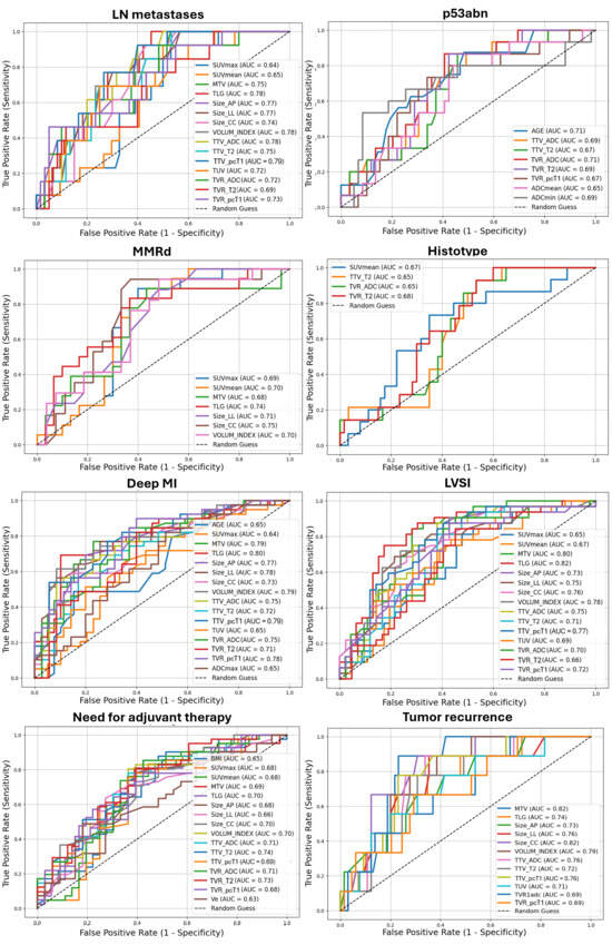 Receiver operating characteristic (ROC) curves with AUC values of [18F]FDG PET/MR and clinical (age, BMI) parameters in predicting different outcomes of EC aggressiveness. Only statistically significant results were displayed. LN: lymph nodes; p53abn: abnormal p53; MMRd: DNA mismatch repair deficiency; LVSI: lymphovascular space invasion; MI: myometrial invasion. Volumetric parameters are expressed in mL or cm3; TVR is expressed as percentage (%); ADC values are expressed as 10−6 mm2/s. Size_AP = antero-posterior diameter, Size_LL = latero-lateral diameter, Size_CC = cranio-caudal diameter, TTV = total tumor volume, TUV = total uterine volume, TVR = tumor volume ratio, ADC = apparent diffusion coefficient, Ktrans = transfer constant, Kep = efflux rate, Ve = extravascular extracellular volume, CER = contrast–enhancement ratio, maxSLOPE = maximum slope of increase, SUV = standardized uptake value, MTV = metabolic tumor volume, TLG = total lesion glycolysis.