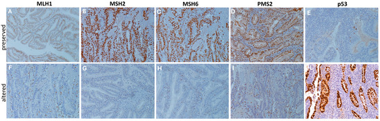 DNA mismatch repair and p53 proteins immunohistochemical staining. Representative immunohistochemical stainings (20×) showing cases of preserved (A–E) and altered (F–L) expression patterns of DNA mismatch repair proteins (MLH1, MSH2, MSH6, and PMS2) and p53 proteins. Protein alteration was identified by the complete absence of nuclear expression in carcinoma cells, with stromal and/or lymphocytic cells used as internal controls, following established guidelines [20]. Staining was performed using specific monoclonal antibodies: p53 (CONFIRM anti-p53 DO7), MLH1 (BOND ready-to-use primary antibody ES05), MSH2 (BOND ready-to-use primary antibody 79H11), MSH6 (BOND ready-to-use primary antibody EP49), and PMS2 (BOND ready-to-use primary antibody EP51).