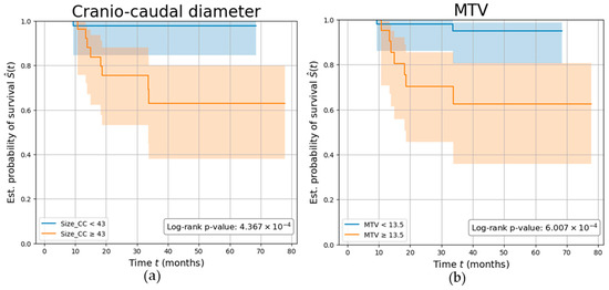 Parameters’ ability in predicting tumor recurrence. Kaplan–Meier curves showing the survival of EC participants stratified by (a) tumor’s cranio-caudal diameter measured on MRI (in mm), (b) tumor’s metabolic tumor volume (MTV) measured on PET (in cm3). The log-rank test p-value was calculated to compare the curves between the two groups.