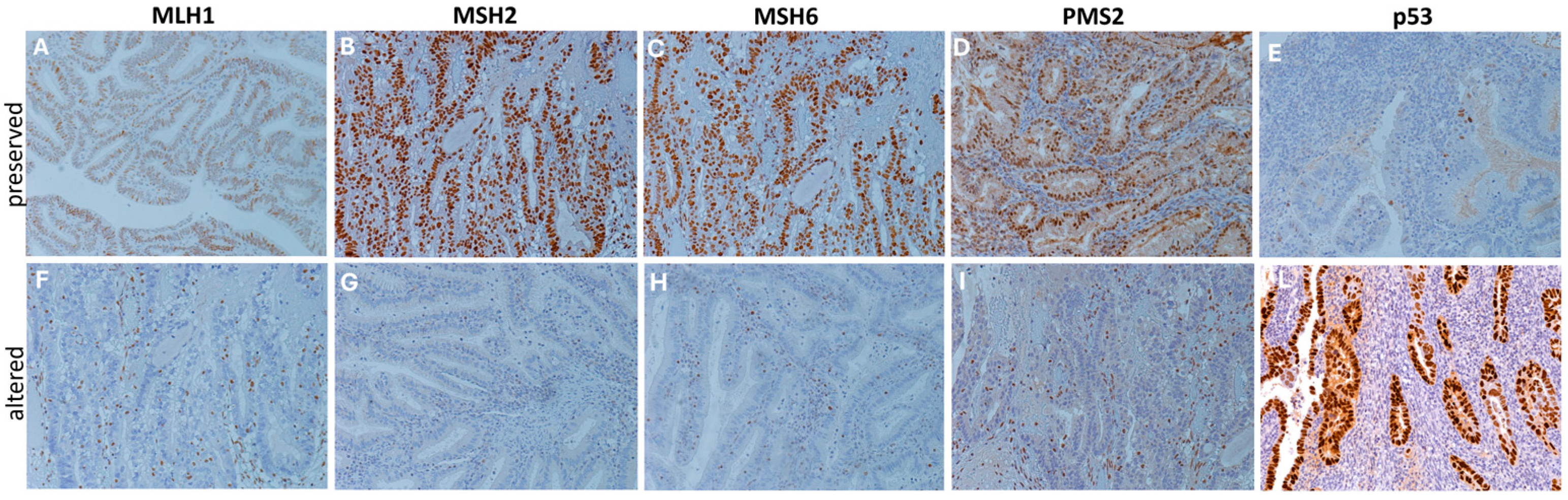 - Stelloo, E.; Jansen, A.M.L.; Osse, E.M.; Nout, R.A.; Creutzberg, C.L.; Ruano, D.; Church, D.N.; Morreau, H.; Smit, V.T.H.B.M.; van Wezel, T.; et al. Practical Guidance for Mismatch Repair-Deficiency Testing in Endometrial Cancer. Ann. Oncol. 2017, 28, 96–102. [Google Scholar] [CrossRef]