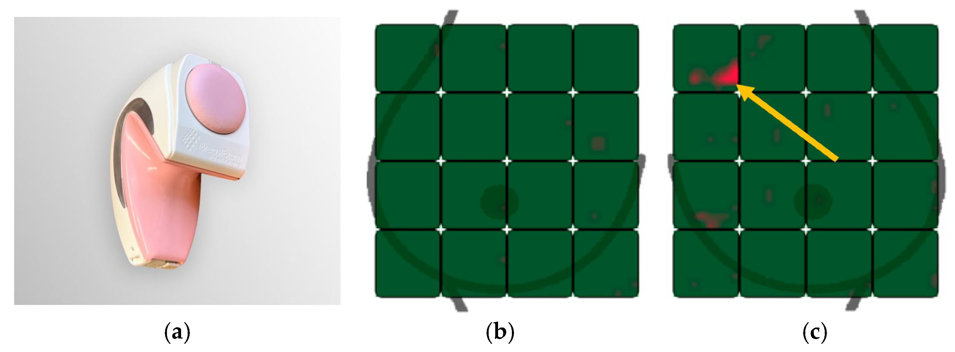 - Clanahan, J.M.; Reddy, S.; Broach, R.B.; Rositch, A.F.; Anderson, B.O.; Wileyto, E.P.; Englander, B.S.; Brooks, A.D. Clinical utility of a hand-held scanner for breast cancer early detection and patient triaage. JCO Glob. Oncol. 2020, 6, 27–34. [Google Scholar] [CrossRef] [PubMed]