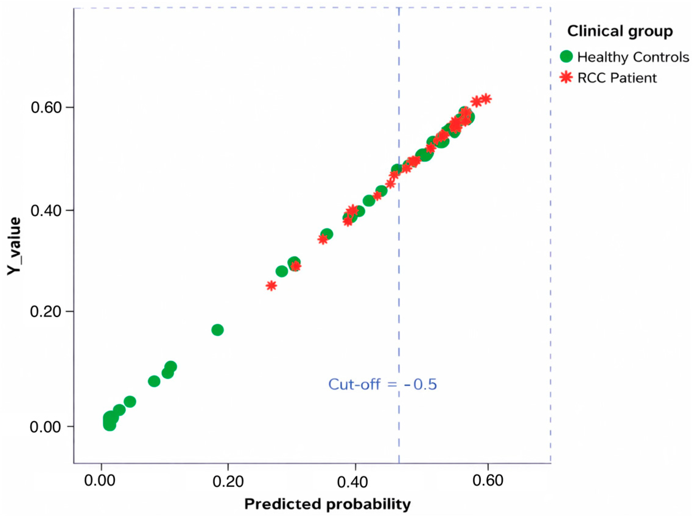 The study cohort comprised 46 patients with histologically confirmed renal cell carcinoma (clear cell, papillary, and chromophobe subtypes), 7 patients with benign renal masses, and 47 sex- and age-matched healthy controls. All patients presenting with a renal mass underwent either radical or partial nephrectomy, depending on the clinical features of the lesion. To ensure representativeness, different histological subtypes of renal cancer were included, with ccRCC being the most frequent variant [