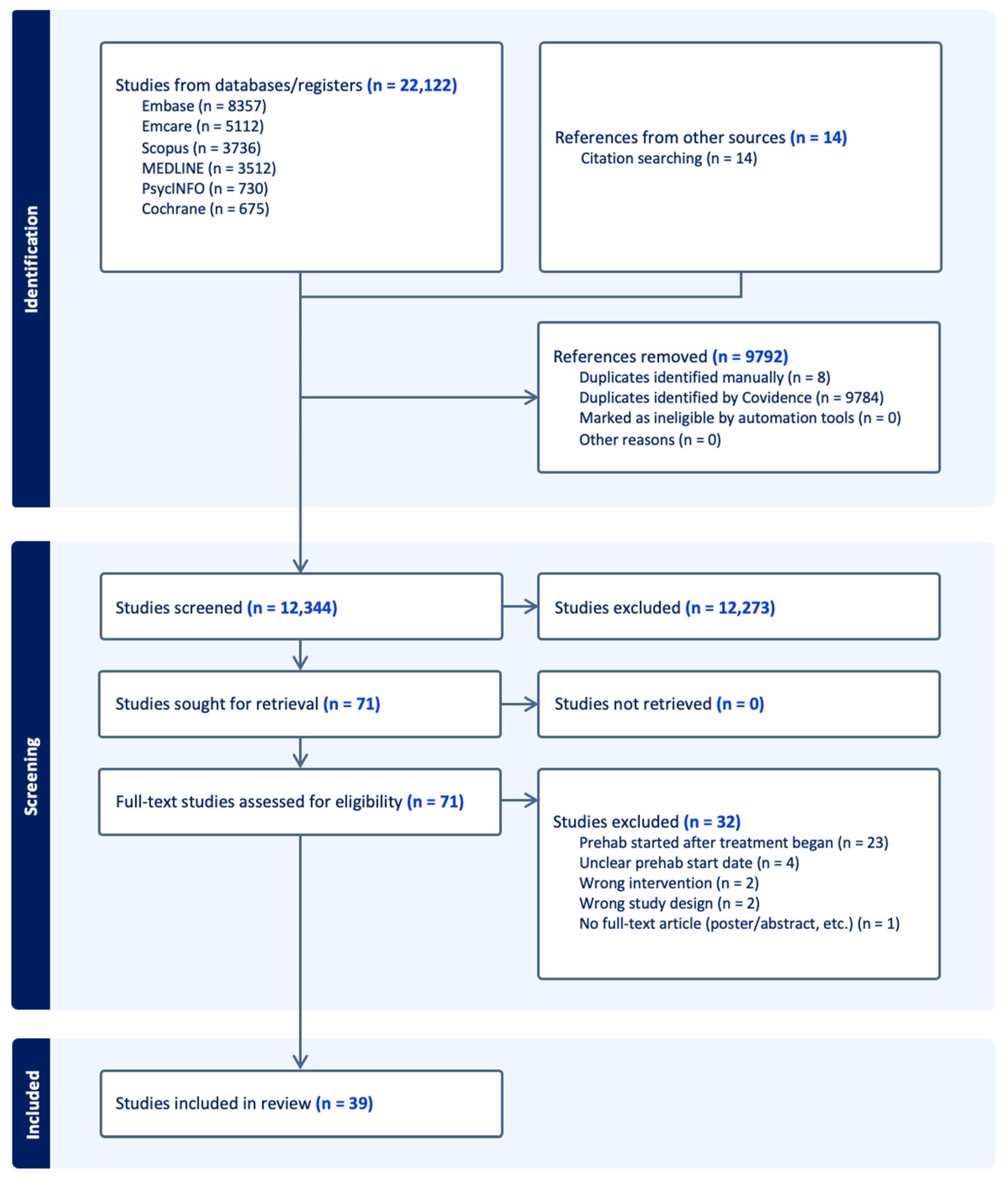 | Prehabilitation Intervention Used | Type of prehabilitation program (multimodal or unimodal), specific interventions used (e.g., exercise, nutrition therapy, and psychosocial support), duration of program, and program setting/context |