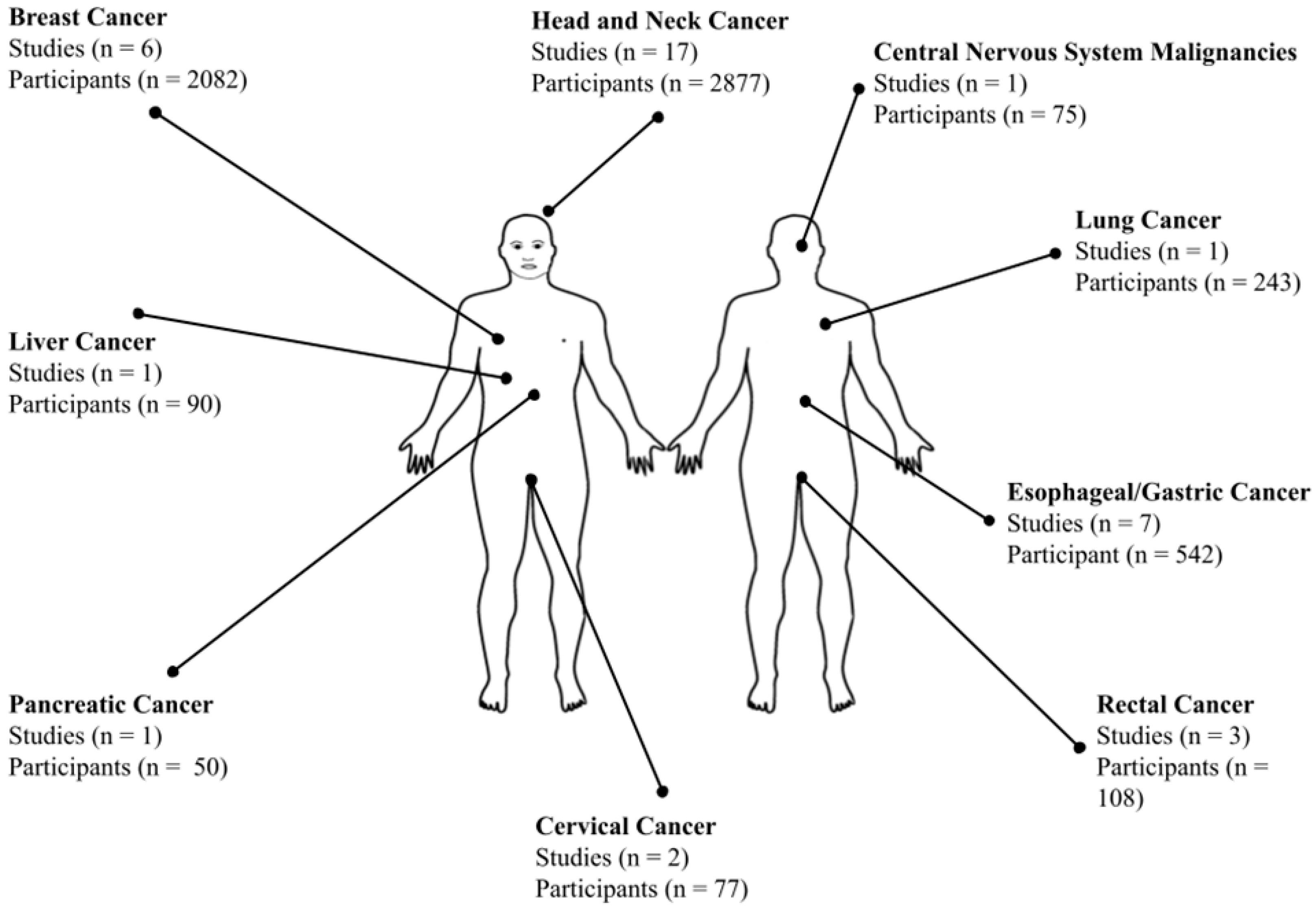 | Population | Number of participants, participant age range, cancer type, and treatment type |