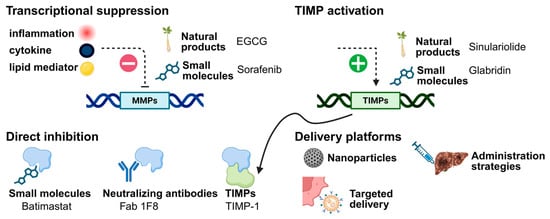 Conceptual overview of therapeutic strategies for modulating MMP activity in HCC. Schematic illustration summarizing the major approaches discussed in Section 3. MMP activity can be reduced through transcriptional suppression driven by inhibition of inflammatory, cytokine, or lipid-mediated signaling pathways, including modulation by natural products and small-molecule inhibitors. Direct inhibition strategies include small-molecule inhibitors and neutralizing antibodies that block MMP catalytic or functional activity. Endogenous regulation can be enhanced through activation or upregulation of TIMPs. Finally, advanced delivery and administration strategies, including nanoparticle-based and targeted delivery platforms, enable spatially and temporally controlled modulation of MMP activity.