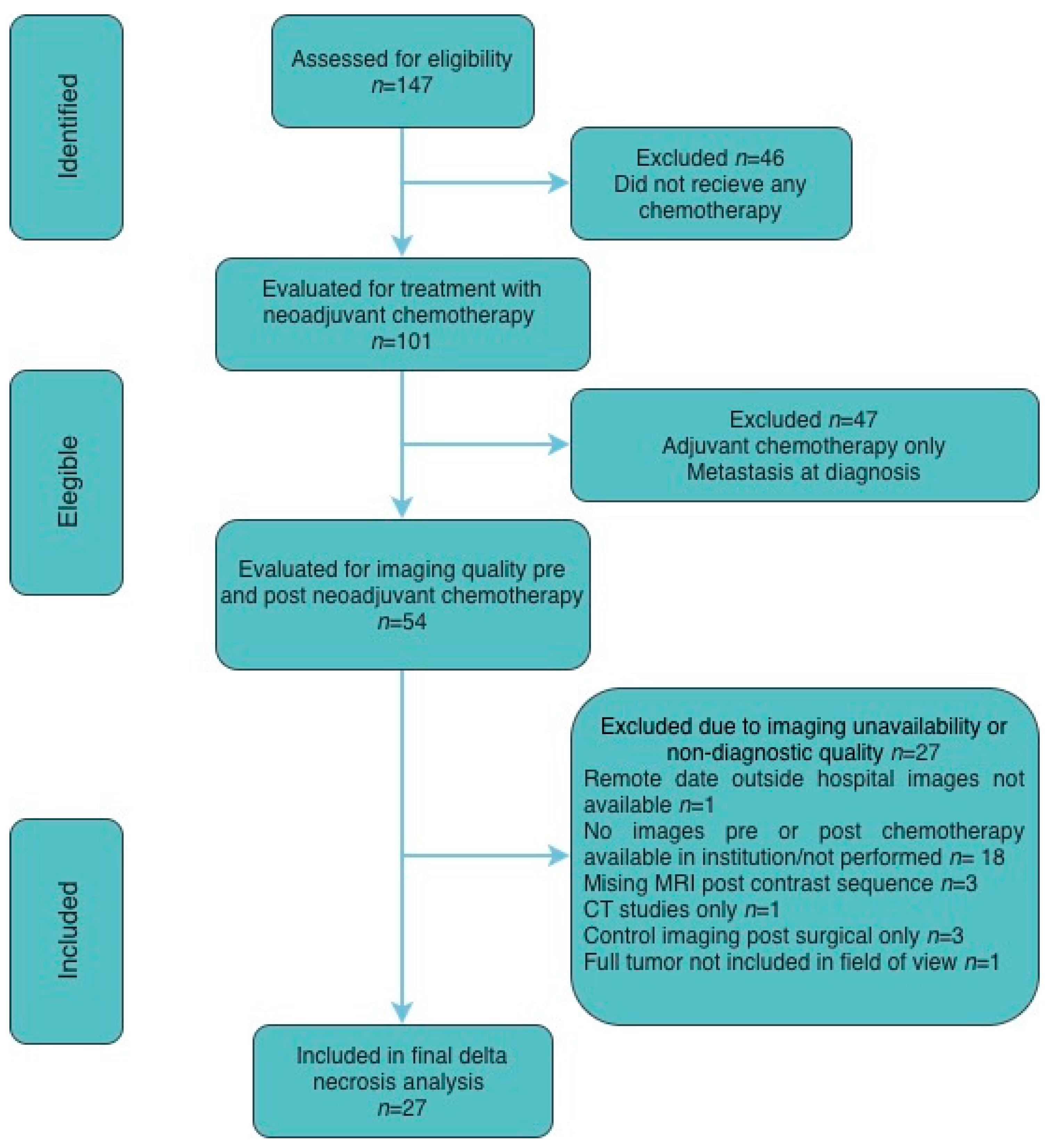 Patients were identified retrospectively and sequentially screened for eligibility, receipt of neoadjuvant chemotherapy, and availability of diagnostic-quality pre- and post-treatment imaging. Exclusions were based on predefined clinical criteria (absence of neoadjuvant chemotherapy, metastatic disease at diagnosis, or adjuvant-only treatment) and technical imaging limitations (missing or non-diagnostic MRI sequences or unavailable studies), resulting in a final cohort of 27 patients included in the analysis. A CONSORT-style diagram is included for details (