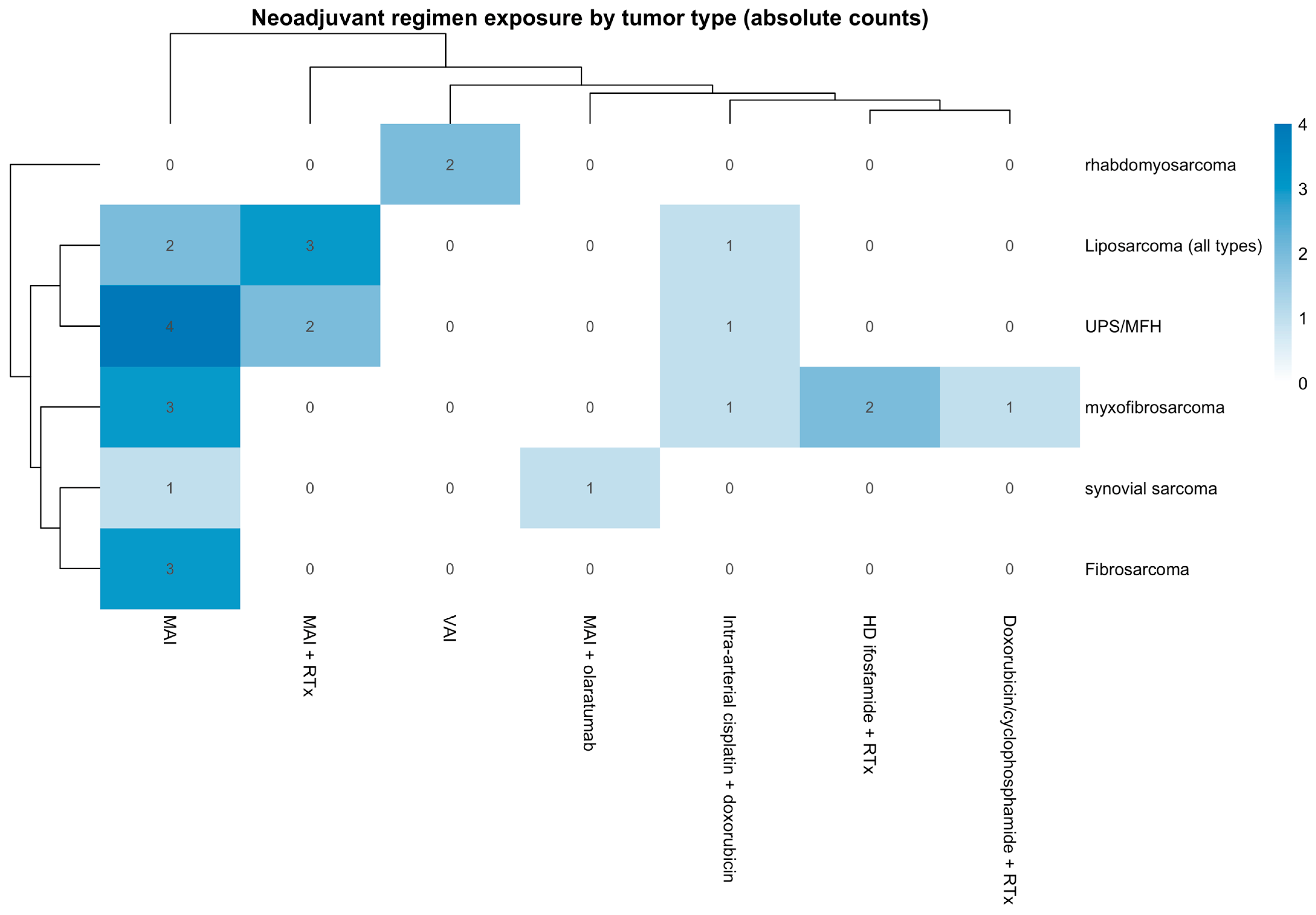 A total of 27 patients with STS were included for analysis in this study. The study included 69.7% (18) males and 33.3% (9) females, with a variety of histological tumor types, including 22.2% (6) liposarcoma [all types including myxoid and pleomorphic liposarcoma], 7.4% (2) synovial sarcoma, 25.95% (7) undifferentiated pleomorphic sarcoma/malignant fibrous histiocytoma (UPS/MFH), 11.1% (3) fibrosarcoma, 25.95% (7) myxofibrosarcoma, and 7.4% (2) rhabdomyosarcoma. The distribution of neoadjuvant chemotherapy regimens across tumor histologies is summarized in