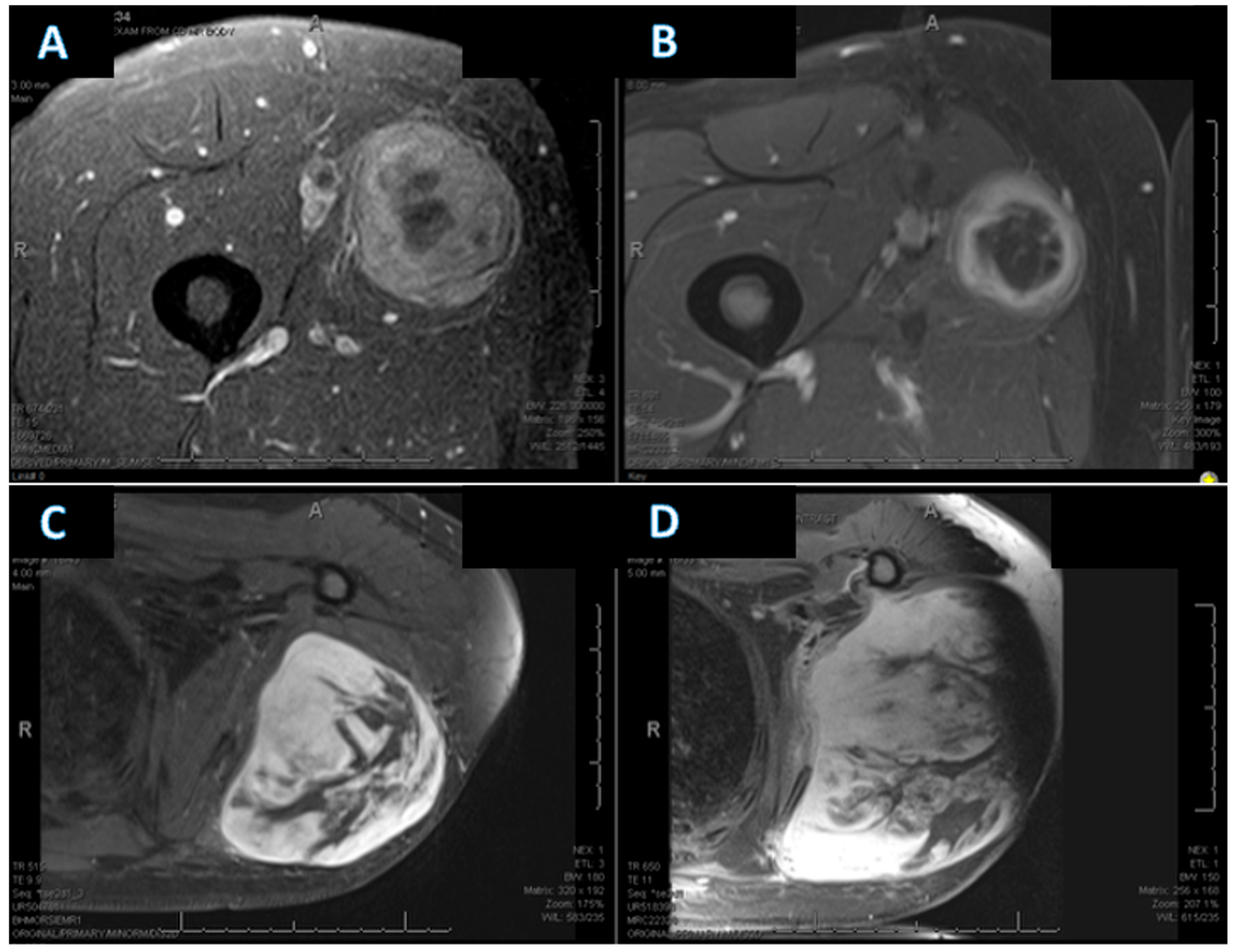 Demographic and clinical data were collected for each patient, including age, sex, and receipt of preoperative or postoperative chemotherapy. MRI examinations were reviewed by an experienced musculoskeletal radiologist, who assigned tumor necrosis for both baseline (MRI-1) and post-treatment (MRI-2) studies using the following semi-quantitative categories: <5%, 5–25%, 25–50%, 50–75%, 75–95%, and >95%. Given the known overlap between necrotic tissue and post-treatment cystic or fibrotic changes on MRI, this semi-quantitative approach using broad necrosis categories was intentionally employed to reduce misclassification bias and interobserver variability, and to reflect routine clinical practice.