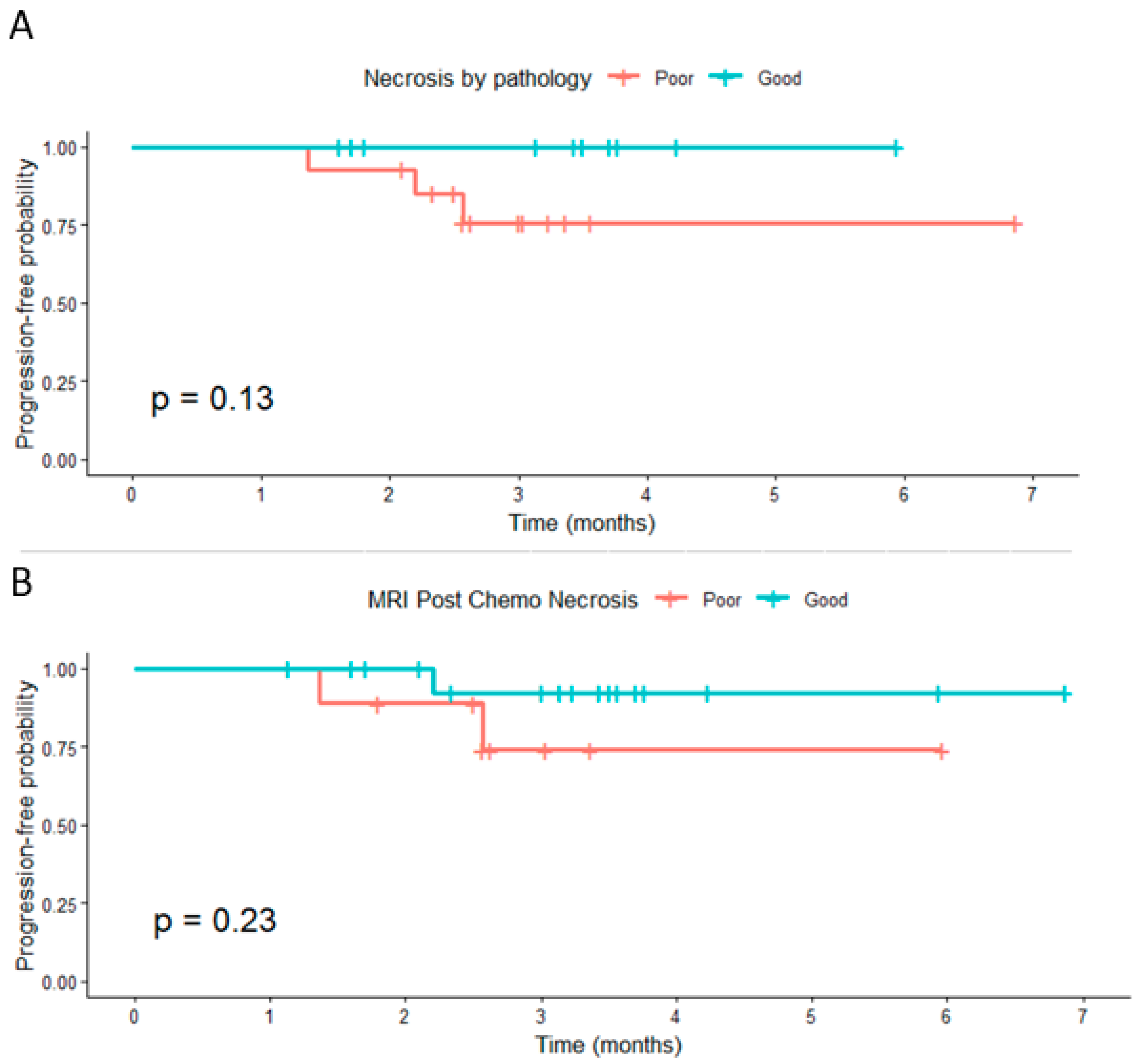 p = 0.13). Similarly, post-chemotherapy MRI necrosis was not significantly associated with PFS (