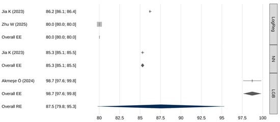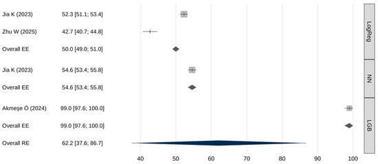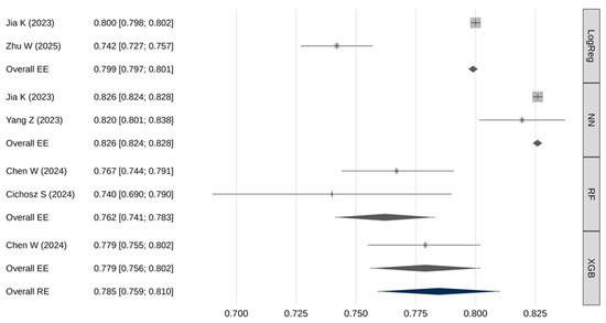 Descriptive and qualitative comparisons of the extracted data were used to summarize differences across AI approaches and methodological frameworks. Meta-analysis and data visualization were conducted using R version 4.5.1 (R Foundation for Statistical Computing), employing the metafor package (version 4.8-0). Random-effects models were applied to obtain pooled estimates of predictive performance and 95% prediction intervals. Fixed-effects models were used for meta-regression analyses and for obtaining pooled estimates within predefined algorithm categories. Heterogeneity across included studies was assessed using Cochran’s Q statistic and the I2 index. For meta-analyses including five or more studies, publication bias was evaluated using funnel plots and Egger’s regression test. Given the anticipated high heterogeneity in sensitivity and specificity estimates, we initially employed univariate random-effects meta-analysis. However, we acknowledge that bivariate models (such as HSROC (Hierarchical Summary Receiver Operating Characteristic)) are more appropriate for diagnostic accuracy meta-analyses and recommend their use in future studies when sufficient data are available.