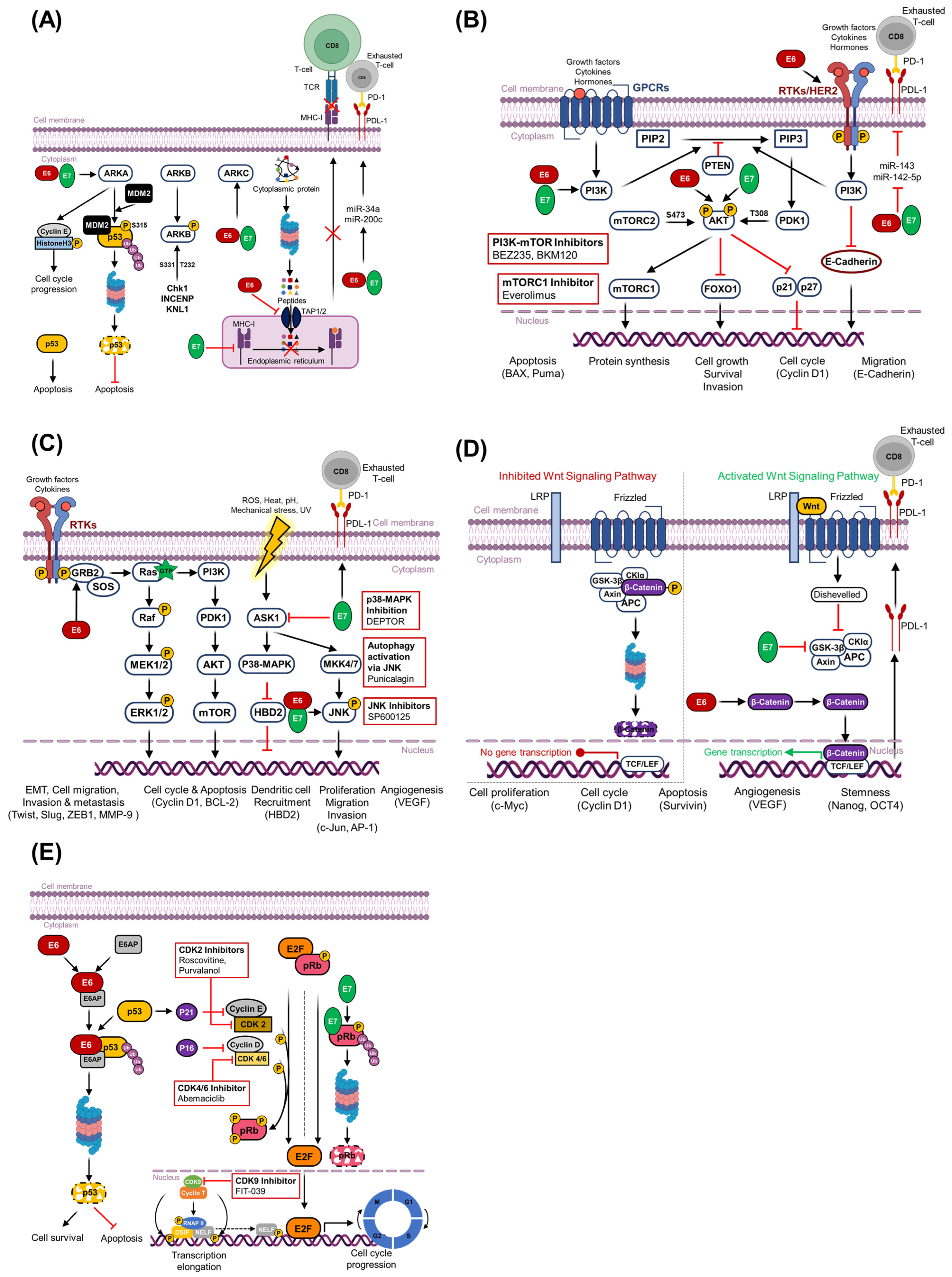 - Rasi Bonab, F.; Baghbanzadeh, A.; Ghaseminia, M.; Bolandi, N.; Mokhtarzadeh, A.; Amini, M.; Dadashzadeh, K.; Hajiasgharzadeh, K.; Baradaran, B.; Bannazadeh Baghi, H. Molecular pathways in the development of HPV-induced cervical cancer. EXCLI J. 2021, 20, 320–337. [Google Scholar] [CrossRef] [PubMed]