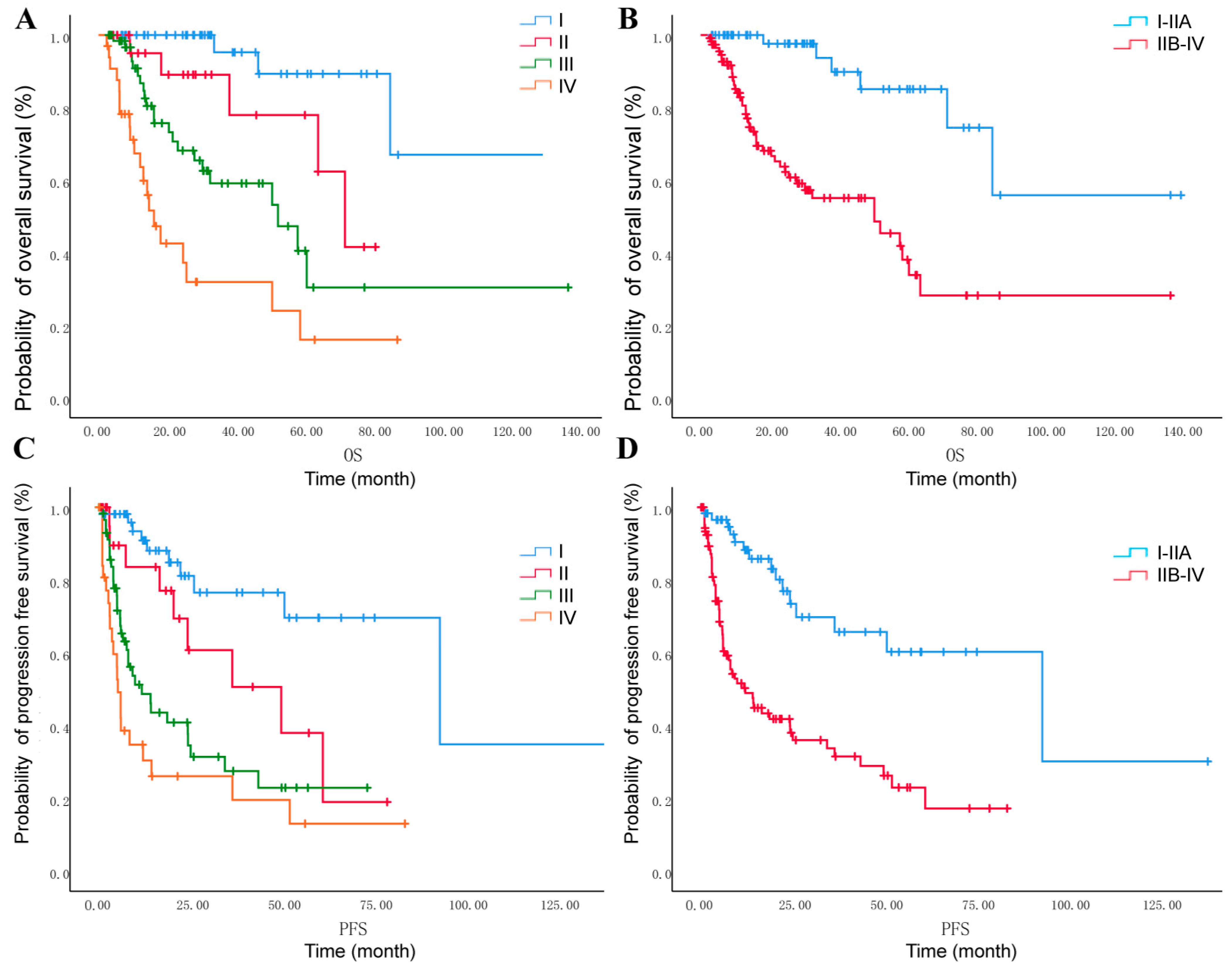 | FIGO Stage | IIB–IV vs. I–IIA | 5.33 (2.17–13.09) | < 0.001 * | 3.81 (1.13–12.80) | 0.031 * | 3.45 (1.87–6.36) | 0.000 * | 1.71 (0.72–4.04) | 0.224 |