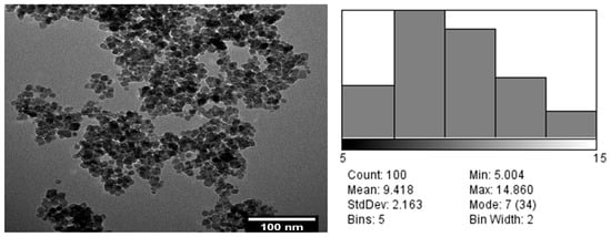 The morphology of the magnetite particles was studied by TEM (Figure 2), and the average particle size and particle-size distribution were estimated by performing at least 100 measurements using a dedicated software program. From analysis of the TEM micrograph and the particle size distribution, magnetite nanoparticles with a regular, almost spherical shape, a relatively high degree of agglomeration, and sizes ranging from 5 to 15 nm, with an average size of 9.418 nm, were obtained.