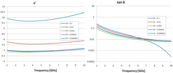 The results of the dielectric evaluation (dielectric permittivity, ε, and loss factor, tan δ) are presented in Figure 3 for various volume ratios (VR) of OA-Fe3O4 inserts across the GHz frequency range. The dielectric permittivity exhibits a gradual increase with frequency, but the number of inserts significantly affects the values. Concerning the Tan δ characteristic, a reduction in the characteristic was observed with increasing frequency, and the effect of insert content is minimal. Ultimately, it was determined that a 0.1% OA-Fe3O4 insert concentration improves the dielectric properties, and the selected frequency of 2.45 GHz for the hyperthermal tests is appropriate when considering the dielectric parameter values.