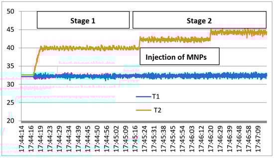 The exposure mechanism under 2.45 GHz microwaves is presented in Figure 7, where T1 denotes the rat temperature reference and T2 the temperature evolution in liver tissue during the two stages of applied hyperthermia, as described in [39]. Stage 1.—Preliminary hyperthermia to activate the liver cells, up to 40 °C. Stage 2.—Injection of the compound based on 0.1% OA-Fe3O4 nanoparticles, which attach with priority to the pre-activated tumor cells, followed by second-stage hyperthermia, up to 44 °C.