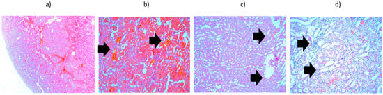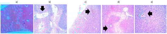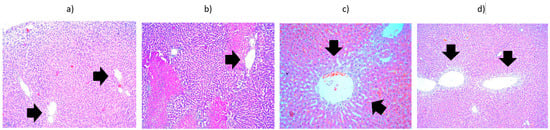 Liver from the third batch, different heating protocols comparison—histopathological aspects highlighted by black arrows: (a) at 15 min, showing infiltrate (lymphocytes, plasma cells, eosinophils) in the portobiliary spaces (×10); (b) at 24 h, showing area of hepatocyte necrosis and neutrophil infiltrate (×10); (c) at 48 h, showing vacuolar degeneration, subcapsular necrosis infiltrated with neutrophils (×10); (d) at 9 days, showing lympho-plasmocytic infiltrate, with intraparenchymal neutrophils and unicellular necrosis (×40).