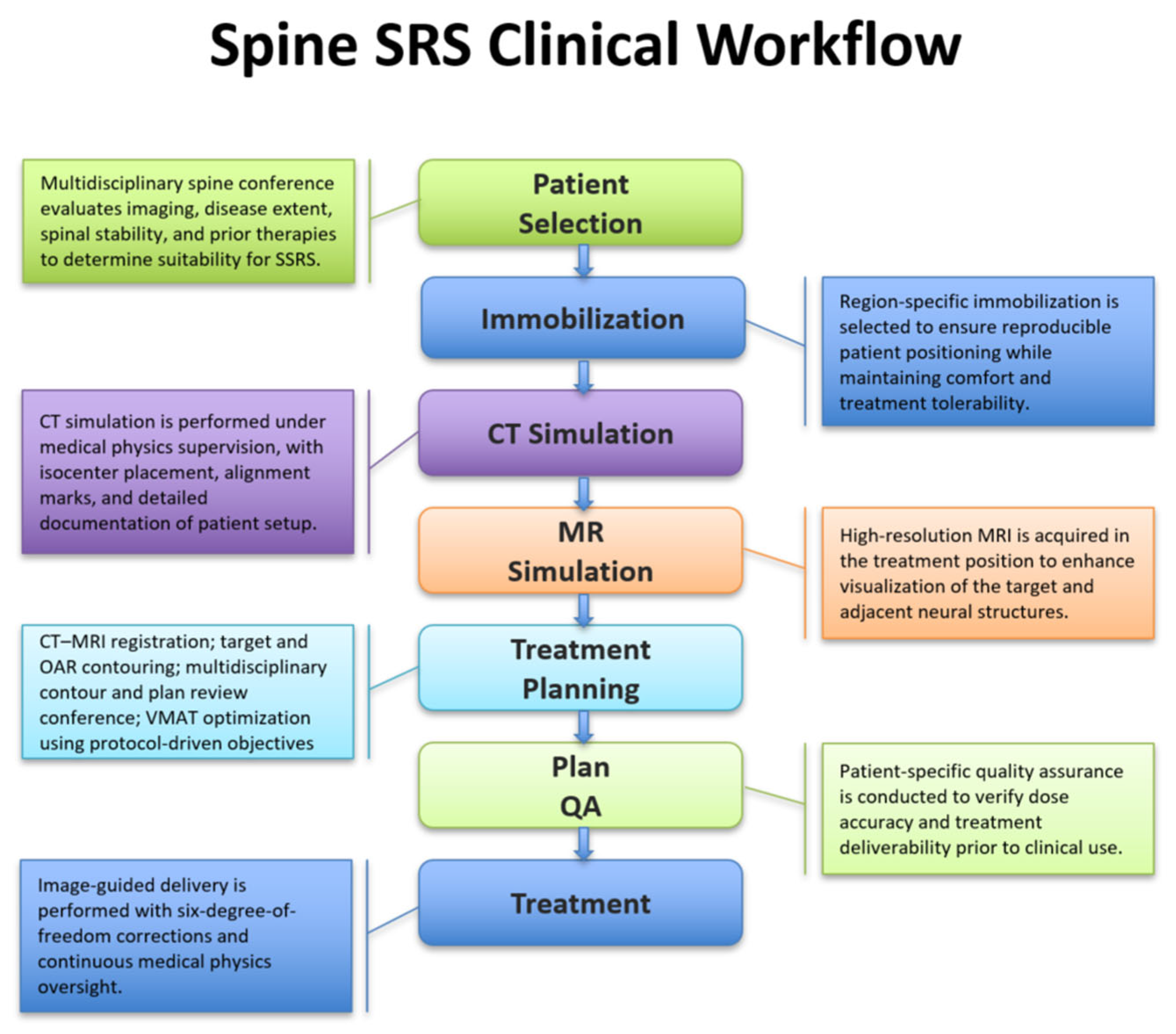 Despite its demonstrated clinical efficacy, SSRS is a technically demanding treatment modality that requires precise patient immobilization, high-quality multimodality imaging, accurate target delineation, and rigorous quality assurance. Submillimeter uncertainties in image registration, target localization, or treatment delivery can result in clinically meaningful dose deviations to the spinal cord or target volume. As SSRS programs expand in volume and complexity, maintaining consistency and safety across staff, imaging platforms, and treatment technologies becomes increasingly challenging.