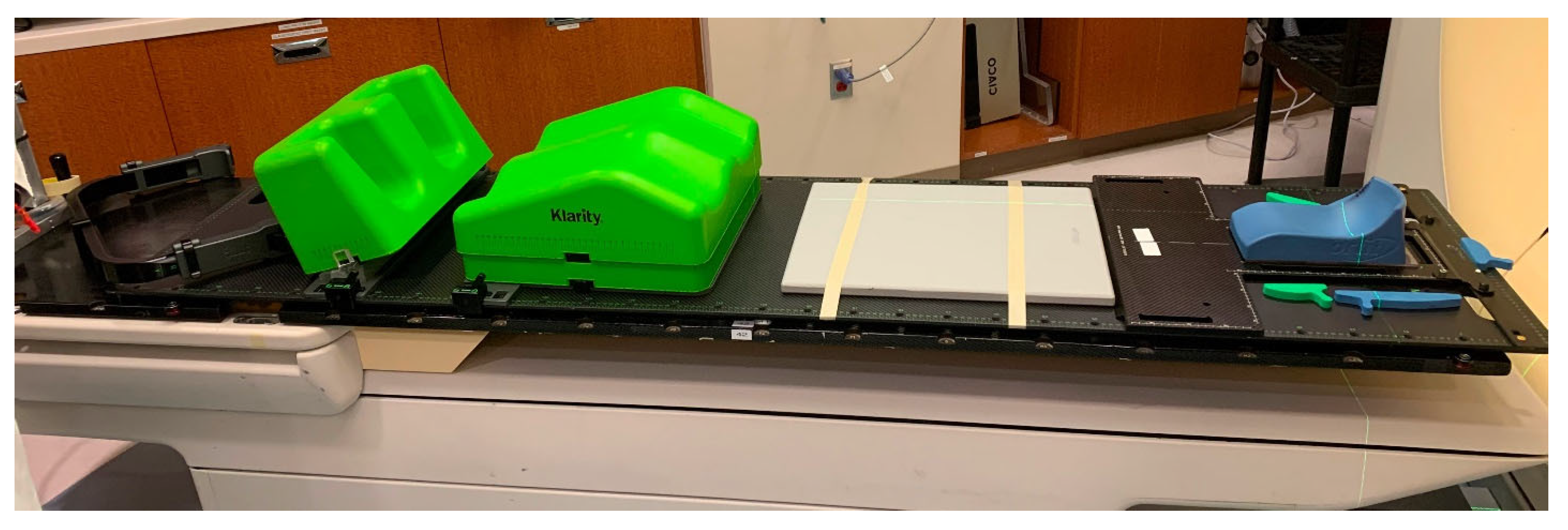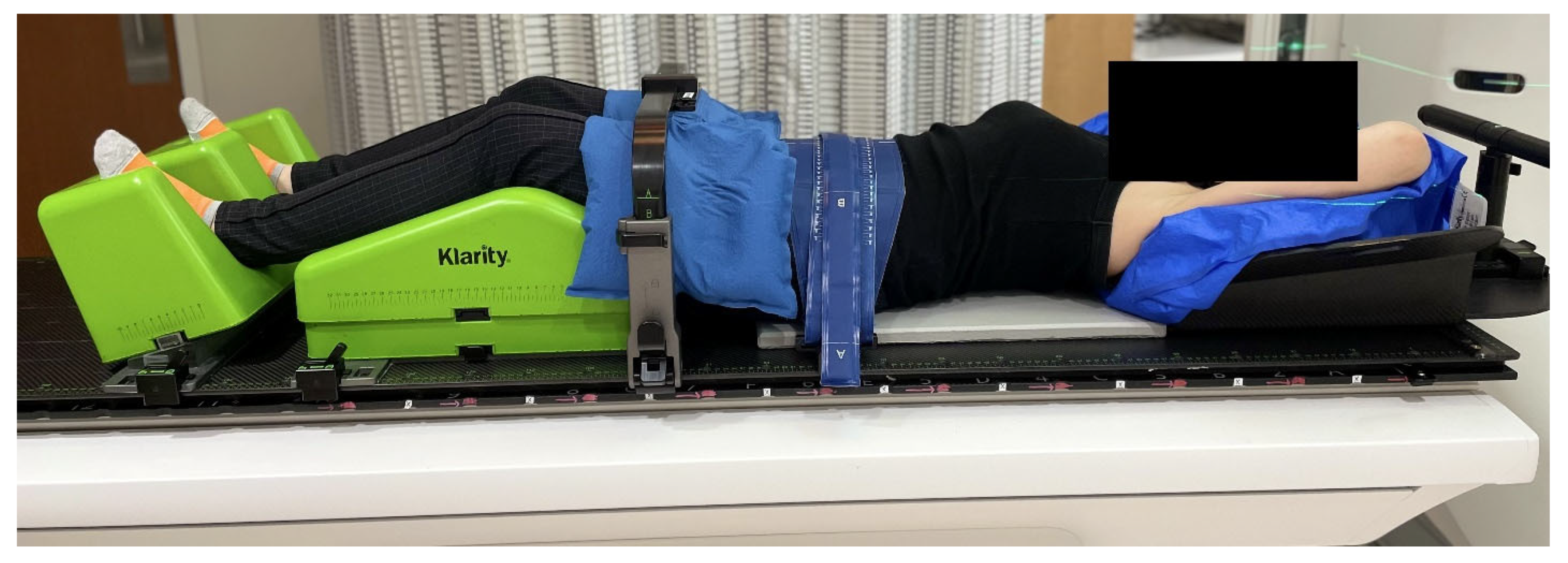- Quan, E.; Krafft, S.P.; Briere, T.M.; Vaccarelli, M.J.; Ghia, A.J.; Bishop, A.J.; Yeboa, D.N.; Swanson, T.A.; Han, E.Y. Comparison of setup accuracy and efficiency between the Klarity system and BodyFIX system for spine stereotactic body radiation therapy. J. Appl. Clin. Med. Phys. 2022, 23, e13804. [Google Scholar] [CrossRef]