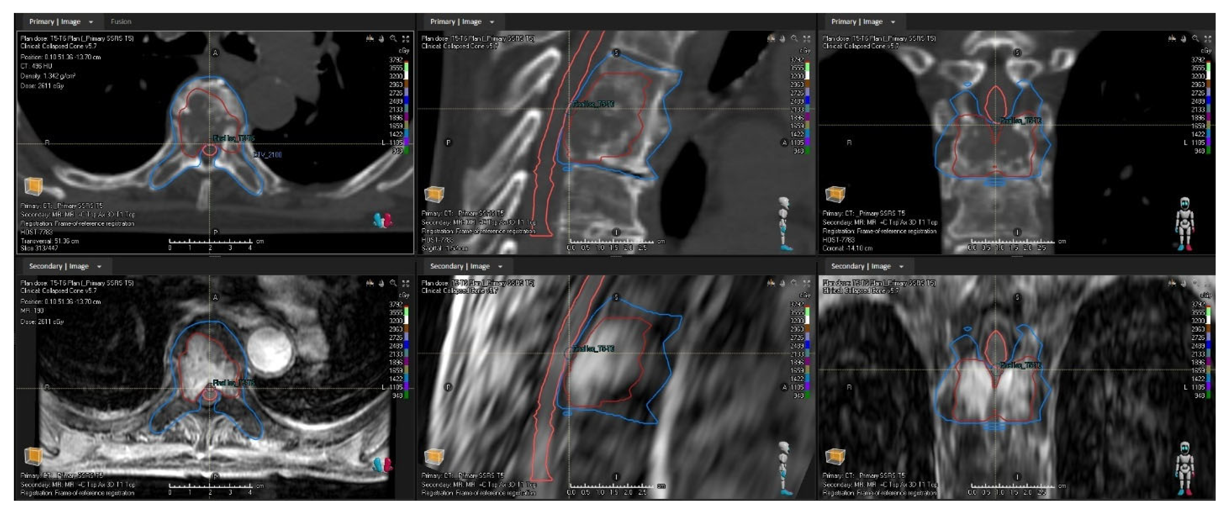 Treatment planning is performed using RayStation® (RaySearch Laboratories AB, Stockholm, Sweden). Planning begins with rigid registration of the MR images to the planning CT. To guide alignment, a temporary vertebral volume of interest is contoured to include the target vertebrae plus one level superior and inferior. Gray-level-based registration is then performed using this volume as the focal region, followed by multiplanar review and manual refinements as needed. In select cases, the CT localization scan is also imported to assist with target identification.
